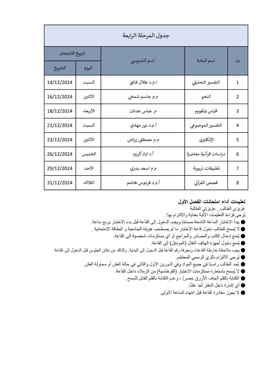 وتتمنى عمادة الكلية لجميع الطلبة التوفيق والنجاح في أداء امتحاناتهم، مع التأكيد على الالتزام بالتعليمات الامتحانية والحضور في المواعيد المحددة لكل مادة.