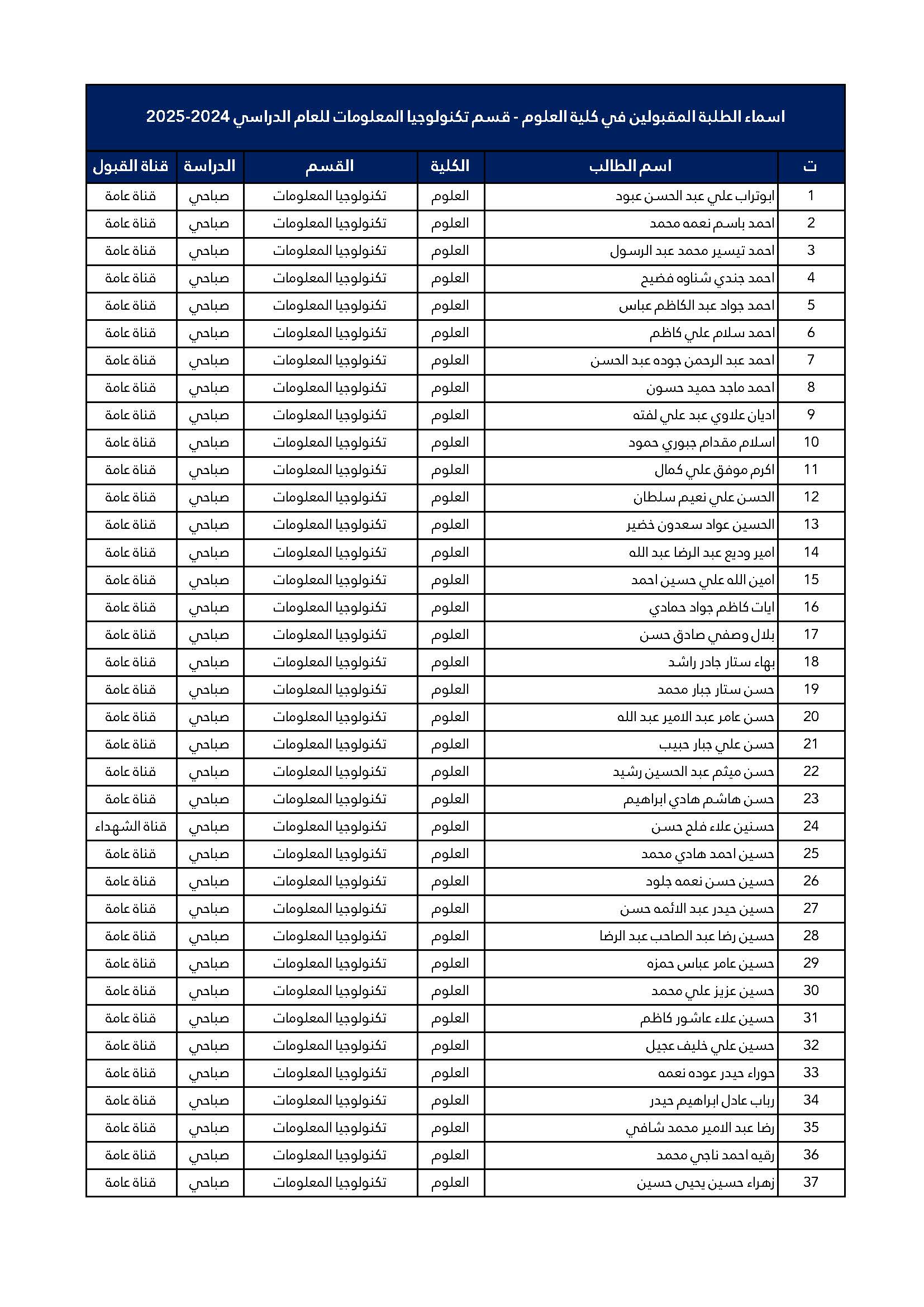 اسماء الطلبة المقبولين للدراسة الصباحية للمرحلة الاولى كلية العلوم قسم تكنولوجيا المعلومات