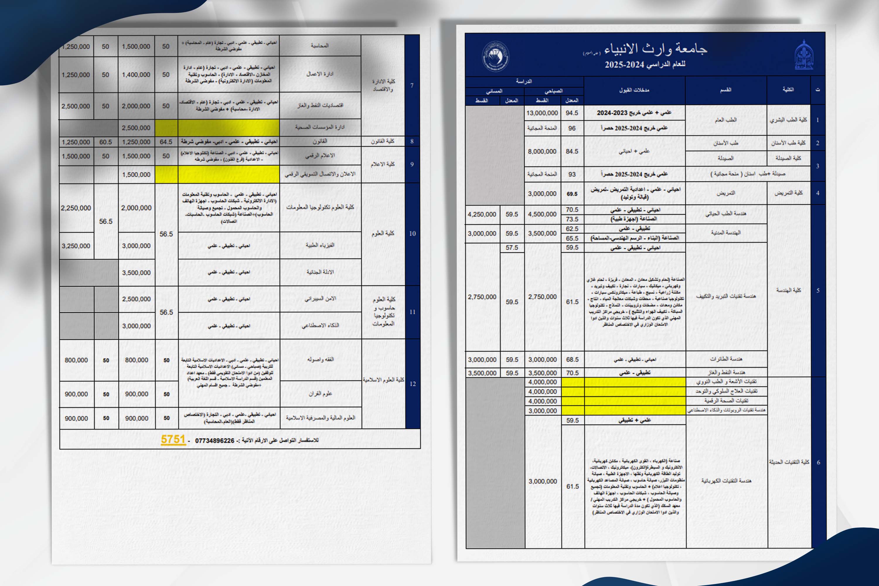 معدلات القبول والاجور الدراسية لكليات جامعة وارث الانبياء