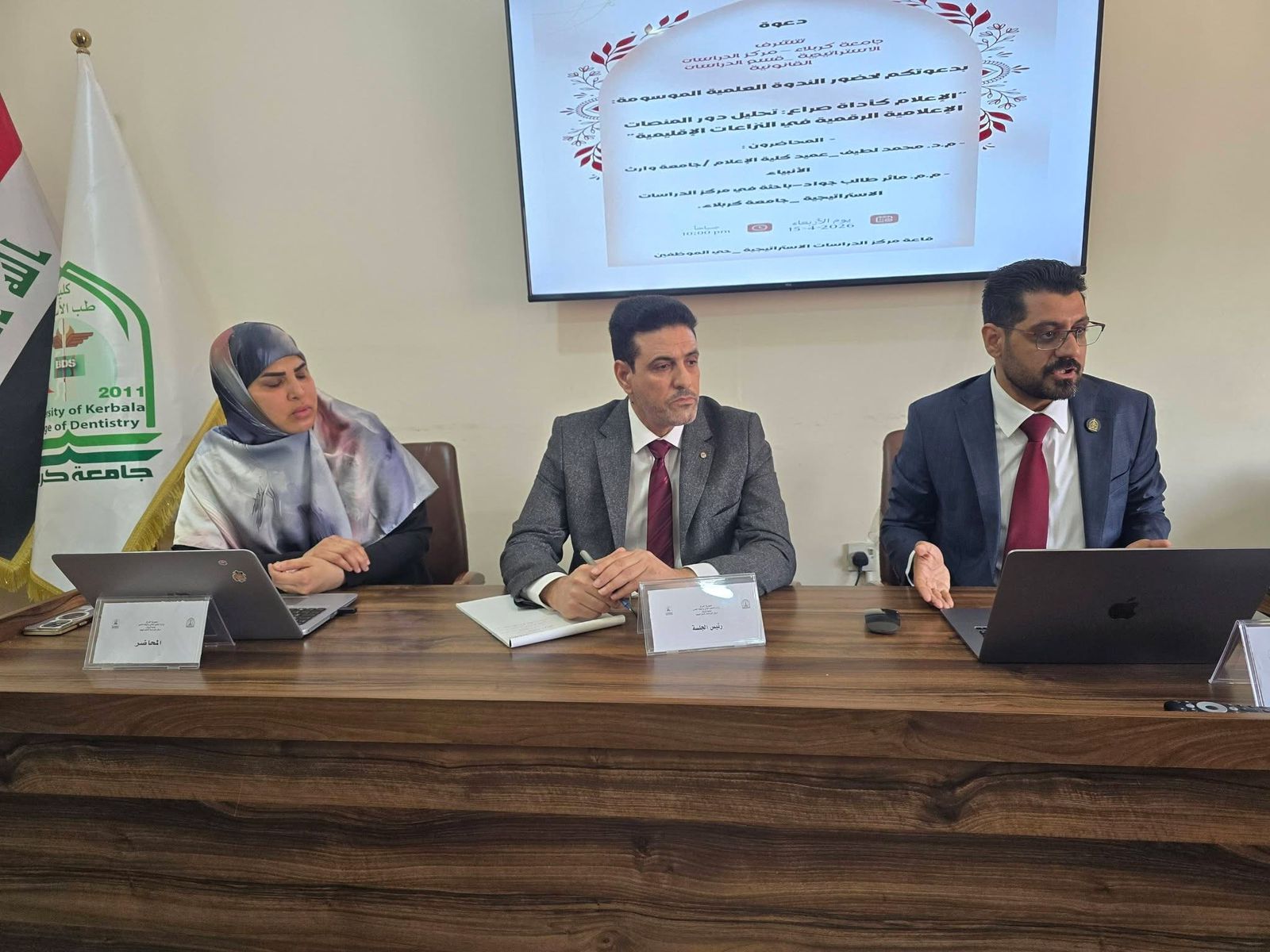 مثّل الكلية في هذه الندوة السيد عميد كلية الإعلام، الدكتور محمد جمال الطيف، إلى جانب الباحثة والإعلامية مآثر طالب، حيث قدّما محاضرة معمقة حول الدور الجديد لوسائل الإعلام في النزاعات المعاصرة.