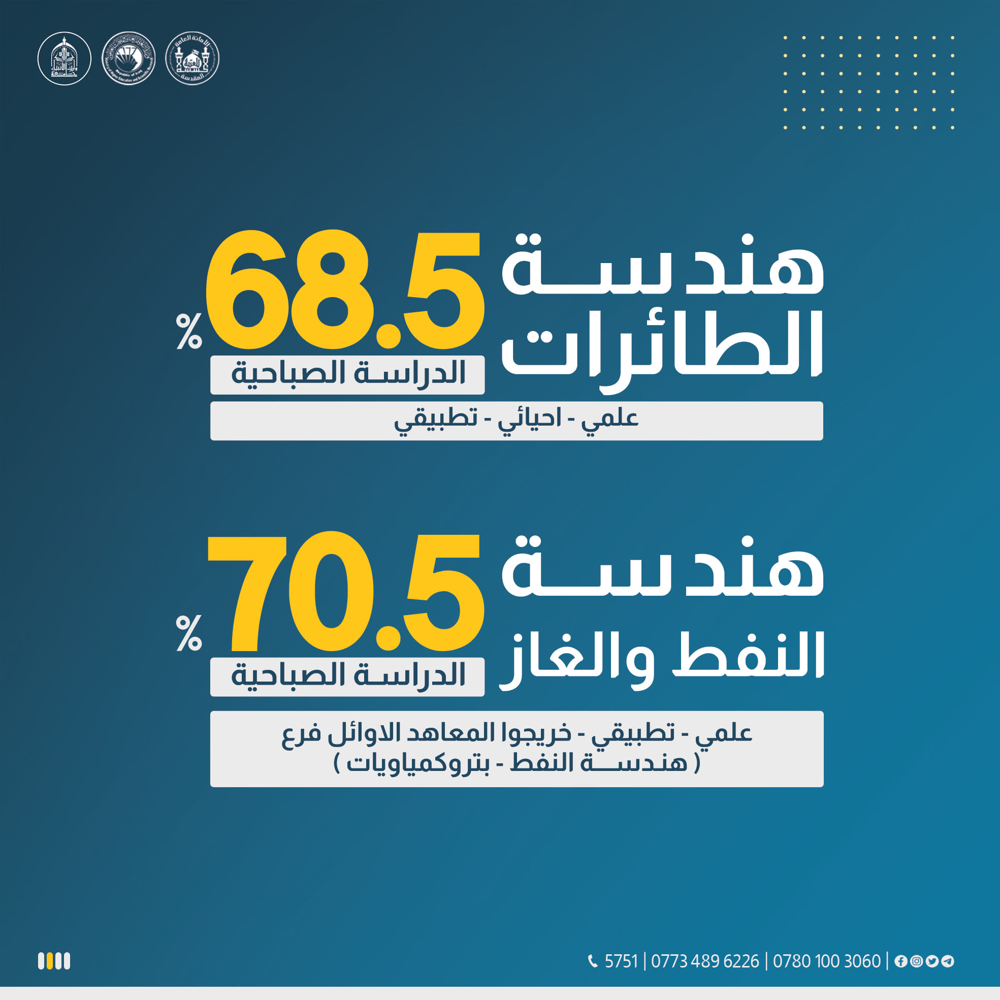 تخفيض الحدود الدنيا للقبول في الدراستين الصباحية والمسائية لتخصصات (الهندسة، التقنيات الهندسية، العلوم) التي معدلات التقديم الحالي فيها (61) صعودا بواقع (درجة واحدة) فقط.