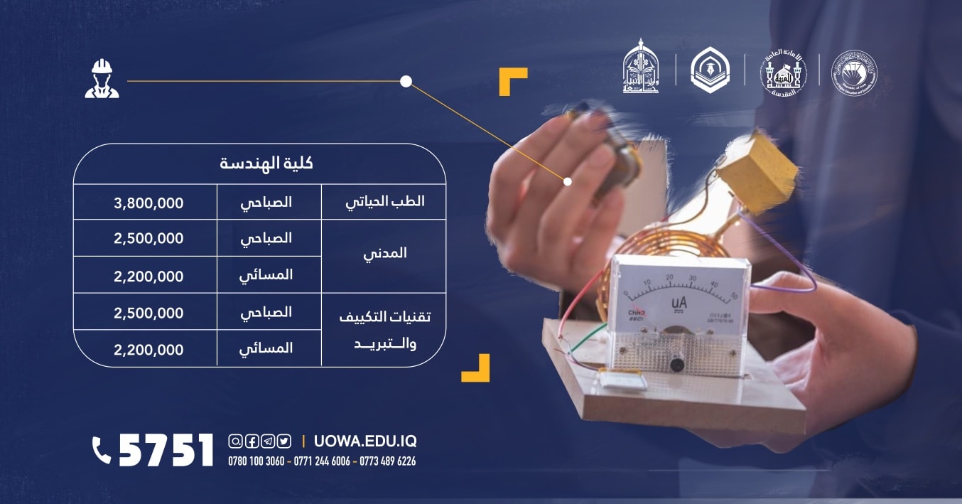 يسر جامعة وارث الانبياء(عليه السلام) أن تعلن للطلبة الاعزاء الراغبين ببدء اولى خطواتهم في طريق النجاح عبر التقديم على كليات واقسام الجامعة ،عن قيمة الاقساط الدراسية للعام الدراسي (2022-2023)
