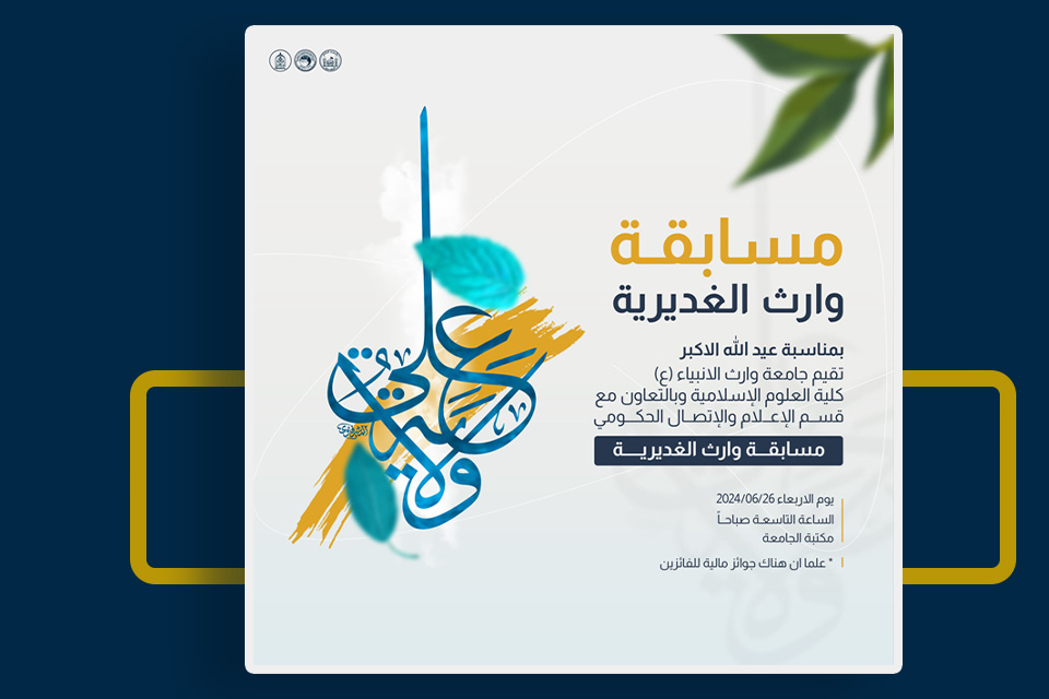 نظمت كلية العلوم الاسلامية في جامعة وارث الأنبياء (مسابقة وارث الغديرية) بالتعاون مع قسم الإعلام والإتصال الحكومي، بمناسبة عيد الله الأكبر عيد الغدير الأغر.