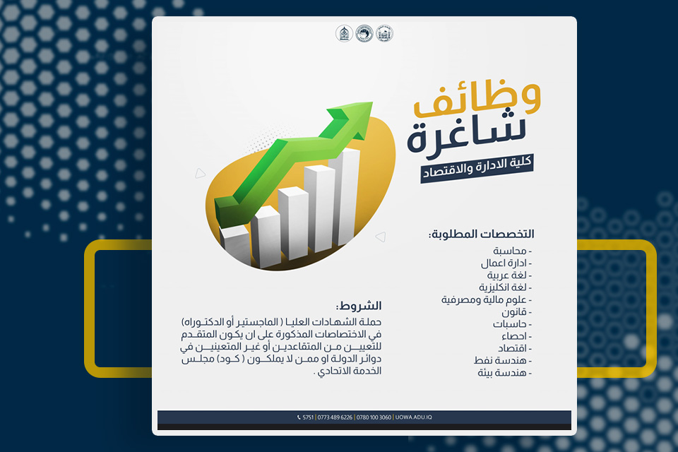 تعلن جامعة وارث الانبياء(عليه السلام)/ كلية الإدارة والإقتصاد عن حاجتها الى درجات وظيفية (متقاعد، أو غير متعين في دوائر الدولة، ولايمتلك كود تعيين على مجلس الخدمة الإتحادي).