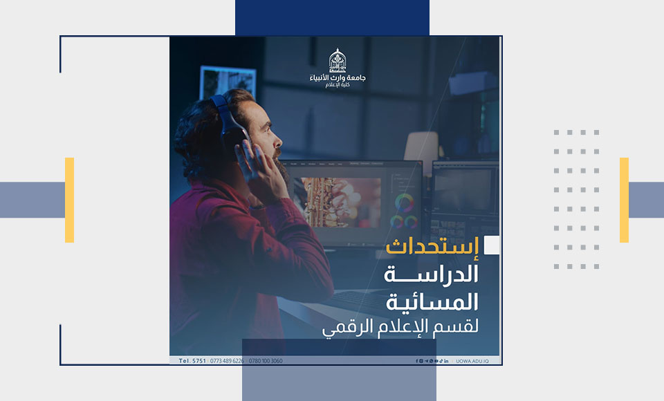 يسر جامعة وارث الأنبياء (عليه السلام) الإعلان عن استحداث الدراسة المسائية لقسم الإعلام الرقمي في كلية الإعلام. سيتم فتح باب التقديم عند إطلاق الاستمارة الإلكترونية للجامعات والكليات الأهلية من قبل وزارة التعليم العالي والبحث العلمي.