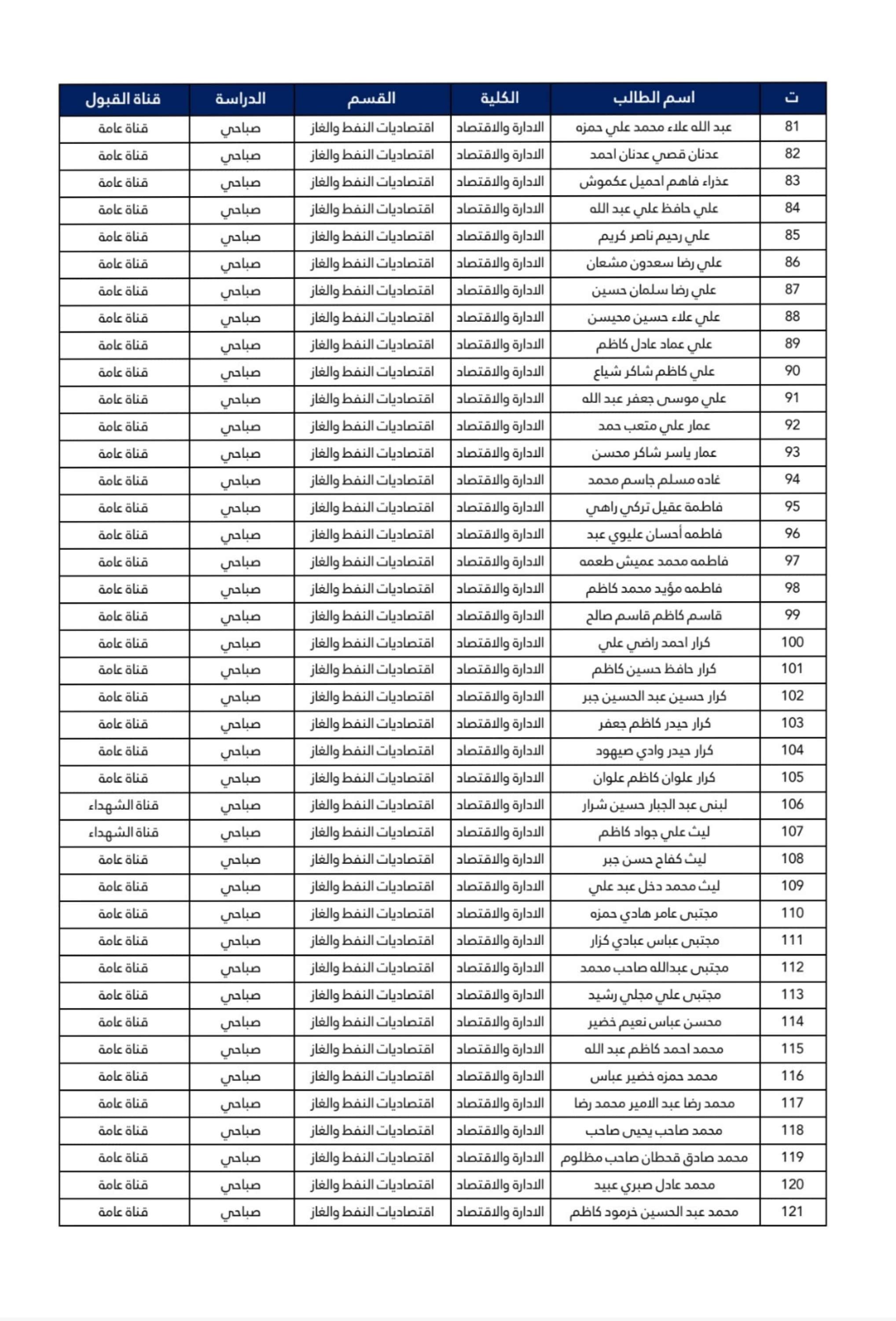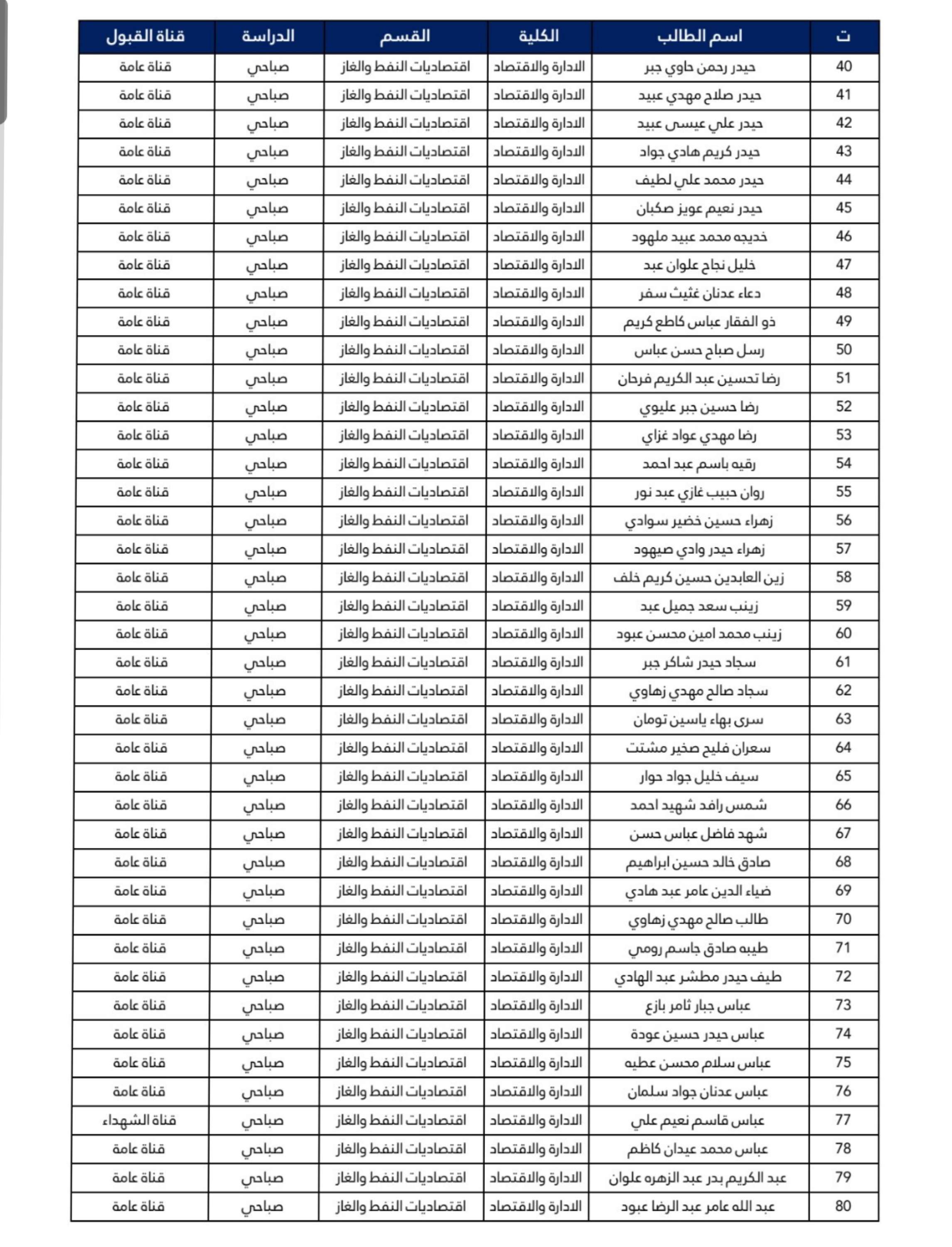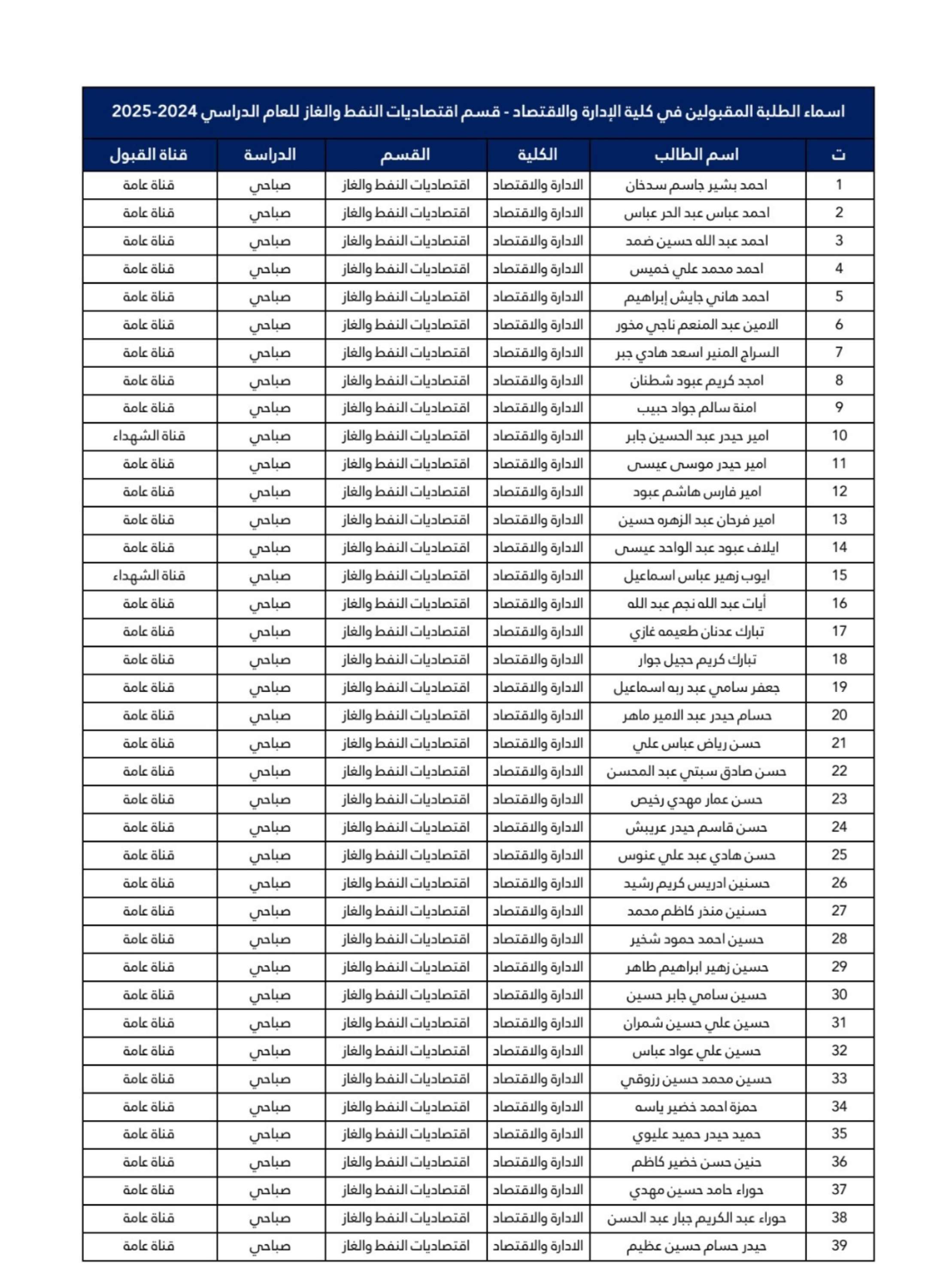اسماء طلبة المرحلة الأولى قسم اقتصاديات النفط والغاز 2024-2025