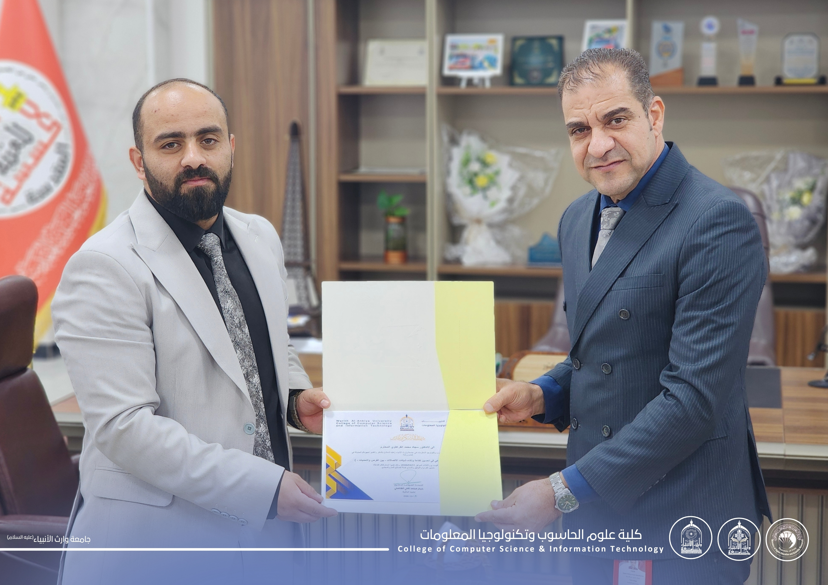 وفي ختام الورشة، قام م.م. علي محمود علي، مقرر قسم الذكاء الاصطناعي، بتكريم المحاضرين ومنحهم شهادات شكر وتقدير، تثمينًا لجهودهم القيّمة ومساهمتهم في إنجاح هذه الفعالية.
