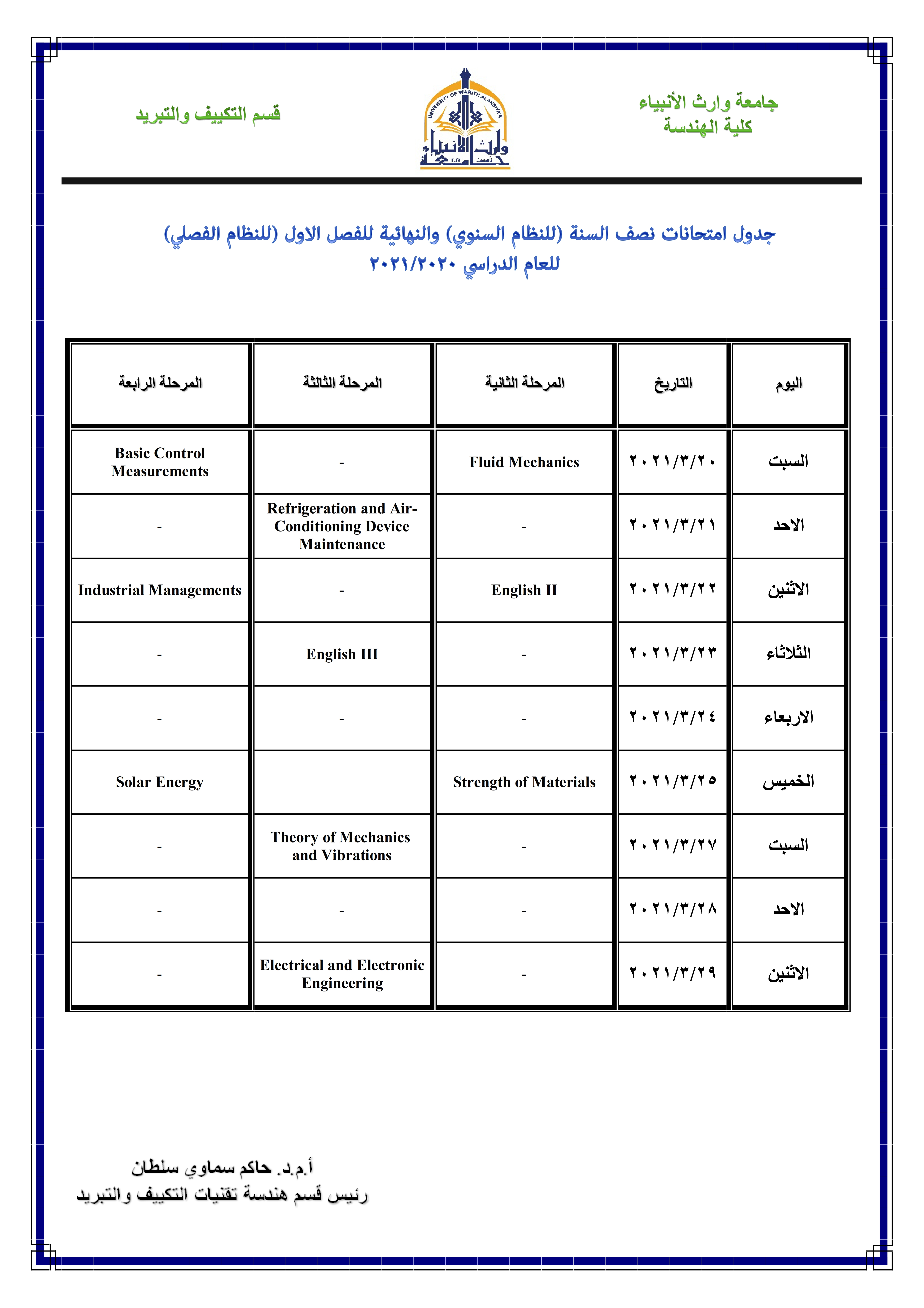 1. تبدأ الامتحانات بتاريخ (20 / 3) للمراحل الثانية والثالثة والرابعة والمرحلة الأولى ستكون بتاريخ (31 / 3) في الساعة 10 صباحاً.