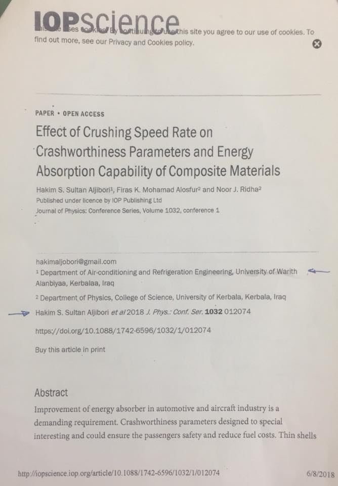 شر الباحث والتدريسي في كلية الهندسة الاستاذ المساعد الدكتور حاكم سماوي سلطان بحثاً علمياً جديداً بعنوان (تأثيرنسب سرعة الصدمات على قابلية امتصاص الطاقة للمواد المركبة في الطائرات) في المجلة العالميّة(Journal of physics) ذات معامل التأثير الرصين ،وقال الدكتور ان البحث هو عبارة عن تصميم جهاز لأمتصاص طاقة الصدمات في الطائرات وبسرع مختلفة والجهاز مصمم بشكل وبمواد مركبة مخلوطة بنِسَب معينة يعطي قابلية اكثر لامتصاص الطاقة مما يقلل نسبة الضرر وعدم وصول هذا الطاقة للركاب، وبقدر معين يمكن للجهاز ان يركب على الطائرات او السّيّارات ، ويذكر ان الباحث له العديد من البحوث المهمة المنشورة في مجلات عالمية ومنها ماهو مختص بالطائرات.