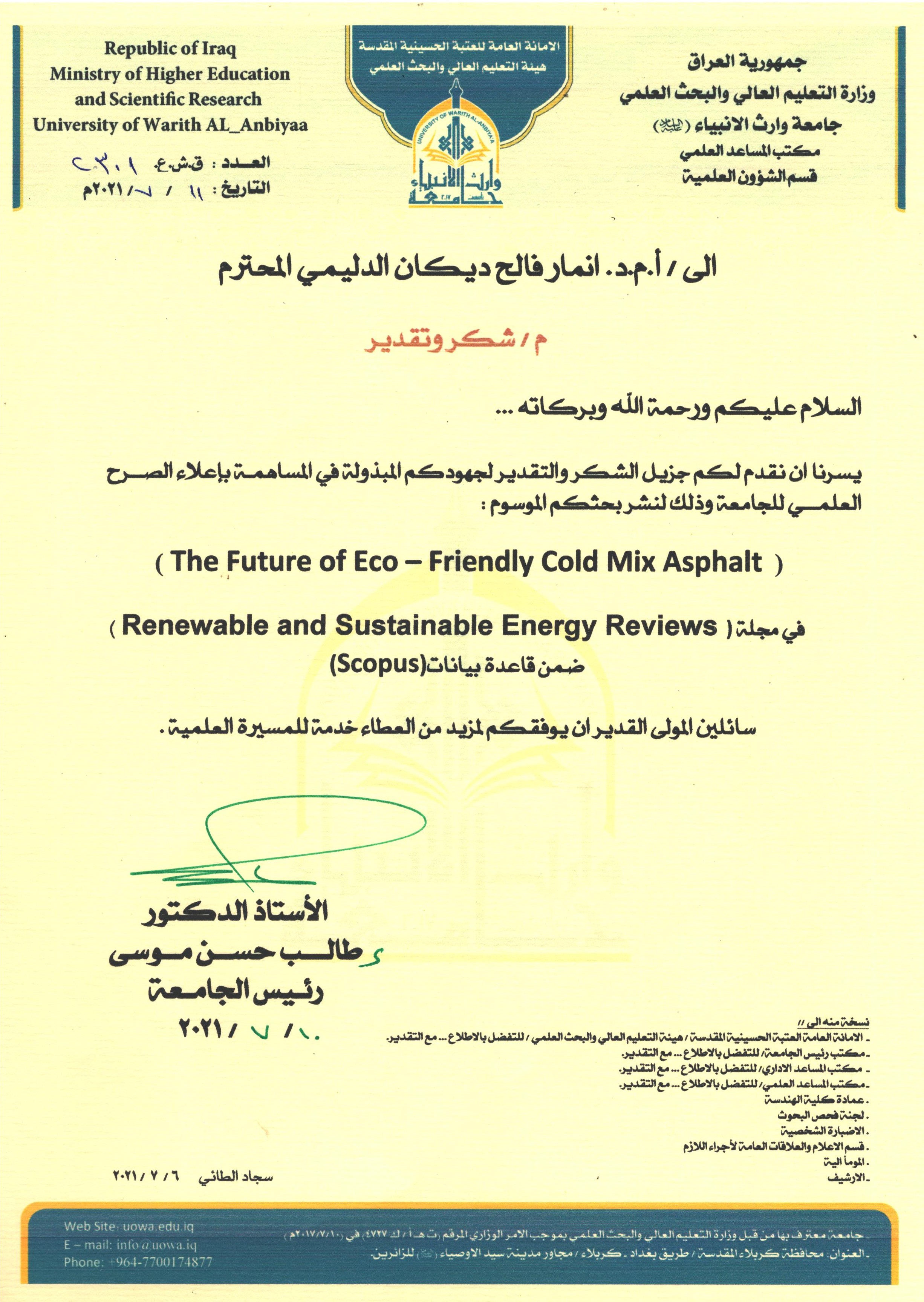 تتقدم جامعة وارث الأنبياء (ع) بالشكر و التقدير إلى أ.م.د. انمار فالح ديكان التدريسي في قسم الهندسة المدنية لجهوده المبذولة في المساهمة بإعلاء الصرح العلمي للجامعة و ذلك لنشر بحثه الموسوم (The Future of Eco - Friendly Cold Mix Asphalt) في مجلة Renewable and Sustainable Energy Reviews ضمن قاعدة بيانات Scopus.