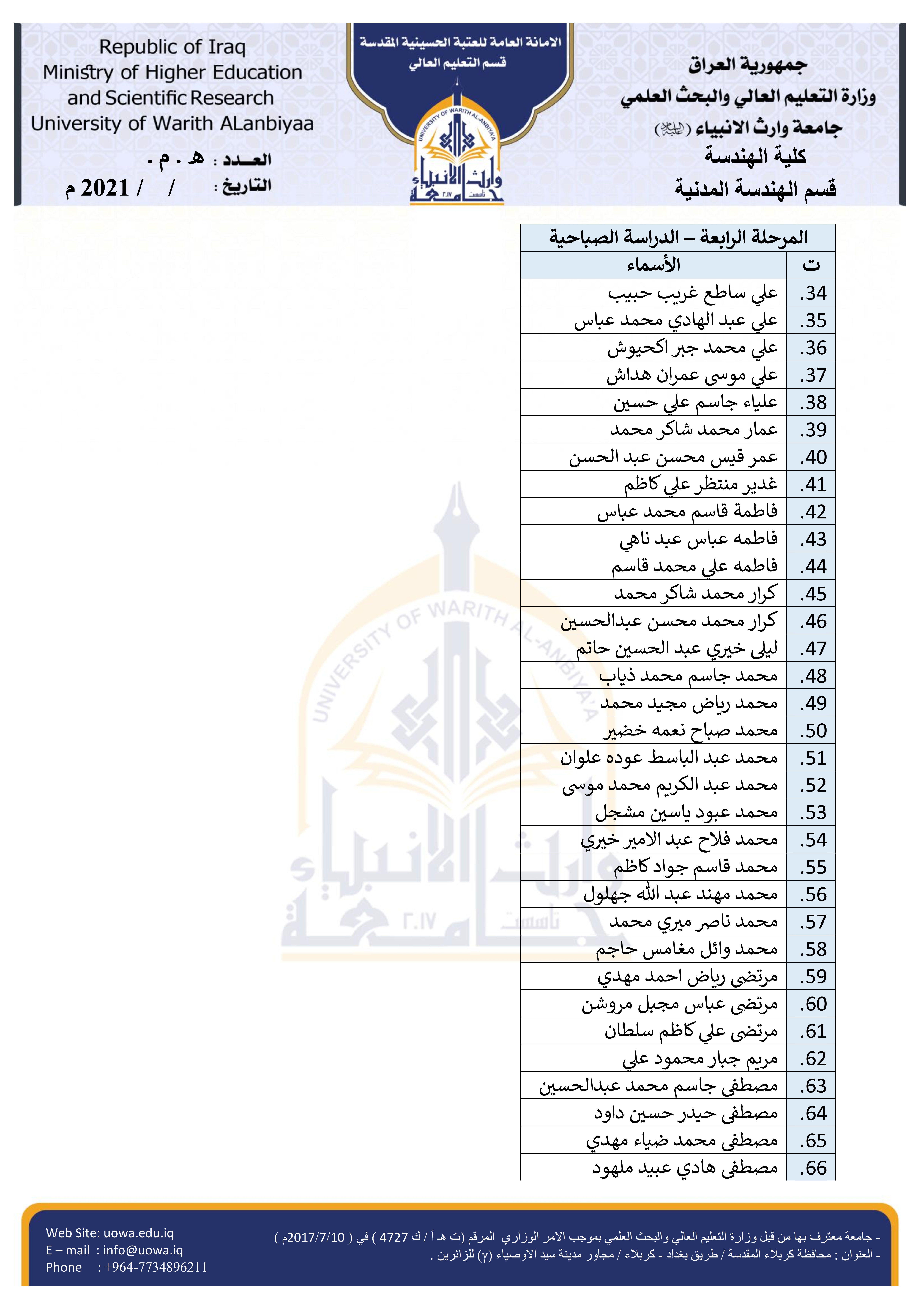 أدناه قوائم الأسماء الخاصة بالطلبة المشمولين بالامتحانات الحضورية لقسم الهندسة المدنية.