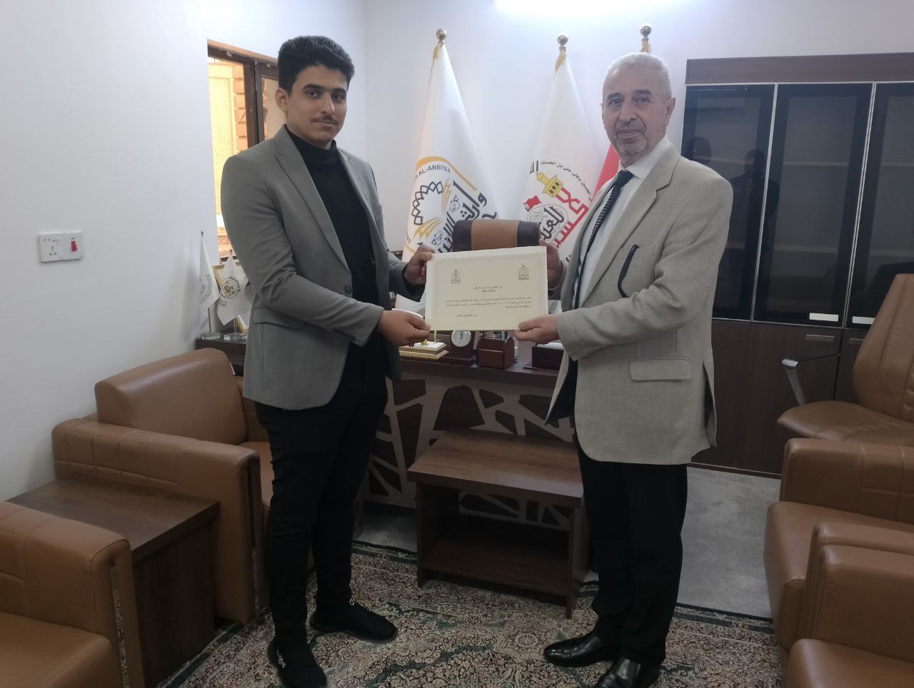 قام عميد كلية العلوم الإسلامية في جامعة وارث الأنبياء، الدكتور طلال الكمالي، يوم الأحد 26 نوفمبر 2023، بتكريم الطالب محمد حسن مصطفى تقديرًا لمشاركته البارعة في مهرجان الفيلم القصير الجامعي للعام 2023-2024.