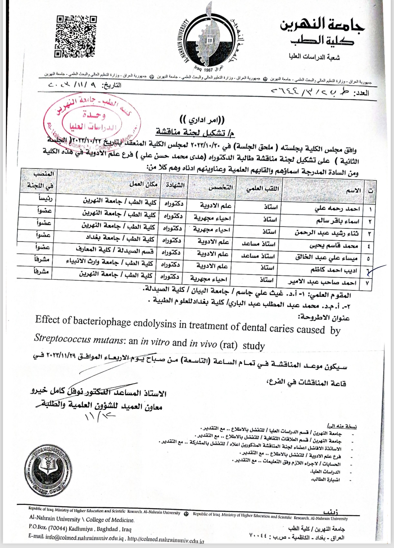 رئيس فرع الادوية عضواً ومشرفاً في مناقشة اطروحة دكتوراه
