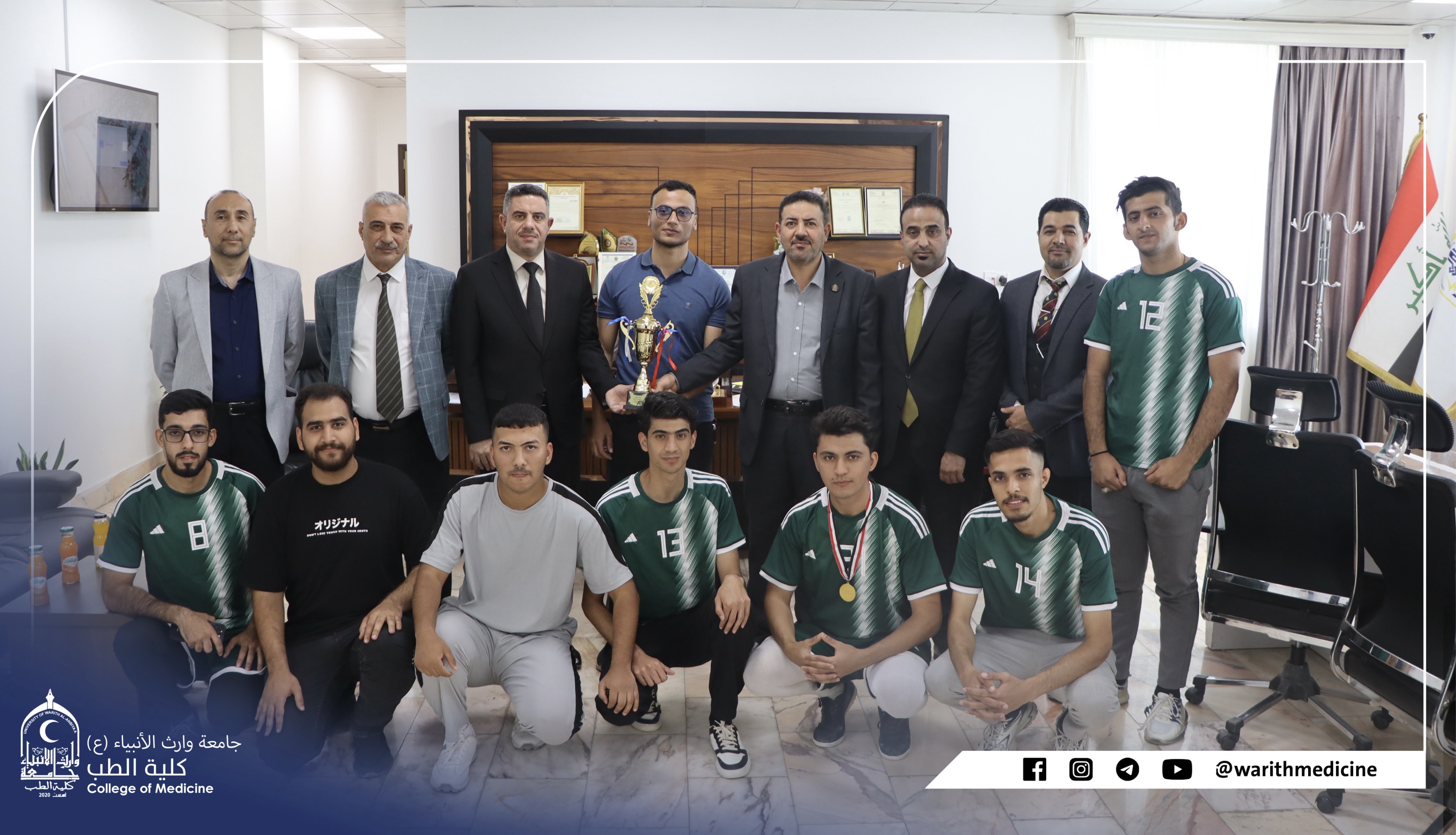 عمادة كلية الطب متمثلة بالسيد عميد الكلية الاستاذ الدكتور علي عبد سعدون المحترم تهنئ فريق طلبة المرحلة الخامسة لحصولهم على المركز الثاني في بطولة الجامعة متمنين لهم دوام النجاح والتألق في النشاطات الرياضية الجامعية .