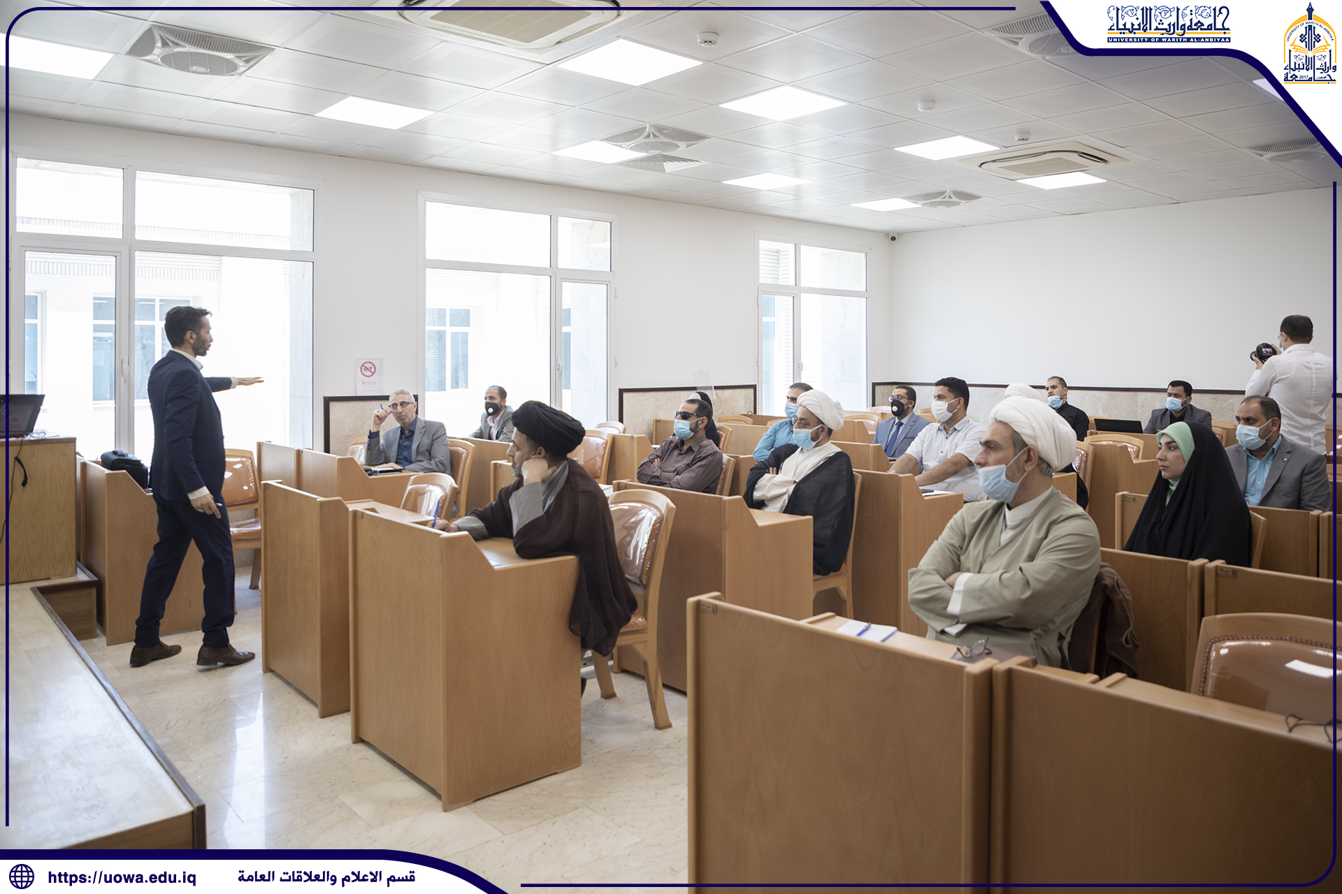 ضمن سعي الجامعة في تطوير كوادرها في جميع العلوم والمهارات اقام قسم التعليم المستمر في جامعة وارث الانبياء (عليه السلام) بالتعاون مع كلية القانون دورة بعنوان (أخطاء تحرير المخاطبات وما يقع فيه الكاتب من عثرات الاملاء) القاها الدكتور (لطيف نجاح القصاب) المتخصص في اللغة العربية وعلى مدى يومان( السبت والاحد) الموافق(29،30/5/2021). تضمن اليوم الاول من الدورة القواعد النظرية للكتابة الصحيحة على مستوى النحو والرسم واليوم الثاني تضمن تطبيقات عملية لتجاوز الأخطاء الشائعة على المستوى الكتابي ، خلال ذلك شارك الحاضرون في كتابة بعض من مفردات اللغة العربية على السبورة و التي تكون موضع اشتباه عند الكثيرين في كتابتها او تلفظها، وجرى توضيحها من قبل الدكتور وما يتبع ذلك من امور هامه يجب ملاحظتها اثناء تحرير الخطابات اللغوية.
