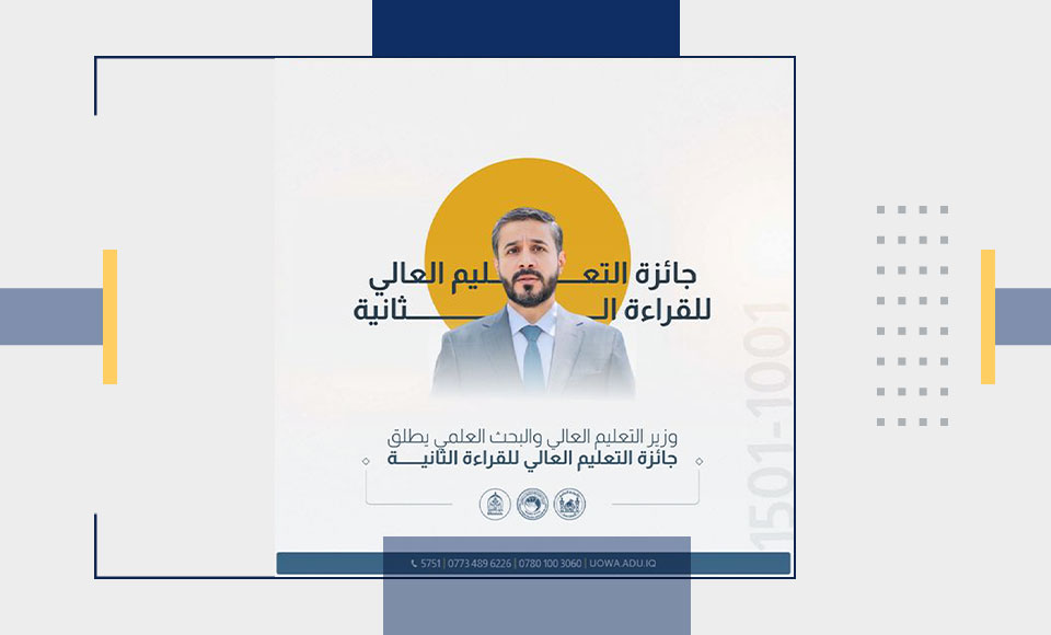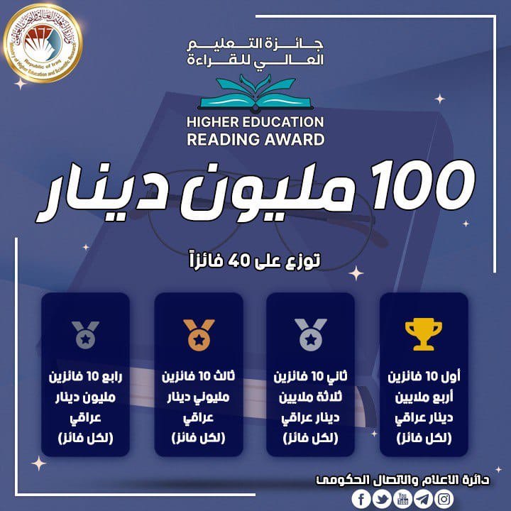 أطلق معالي وزير التعليم العالي والبحث العلمي، الدكتور نعيم العبودي، النسخة الثانية من (جائزة التعليم العالي للقراءة) التي تبلغ قيمتها 100 مليون دينار عراقي، موزعة على 40 فائزاً. تأتي هذه المبادرة كفعالية ثقافية رائدة تهدف إلى تحفيز الوعي الثقافي بين الطلبة، وتشجيعهم على التفاعل الإيجابي مع القراءة غير النمطية. كما تسعى الجائزة إلى توفير بيئة تعليمية جادة تُعزز المسار الثقافي والمعرفي في الجامعات، وتساهم في مراجعة المتون الحضارية وتحليل مضمونها لمواجهة التحديات وتقليل الاستهلاك. للاطلاع على شروط المسابقة والتسجيل انقر هنا https://awards.mohesr.gov.iq/
