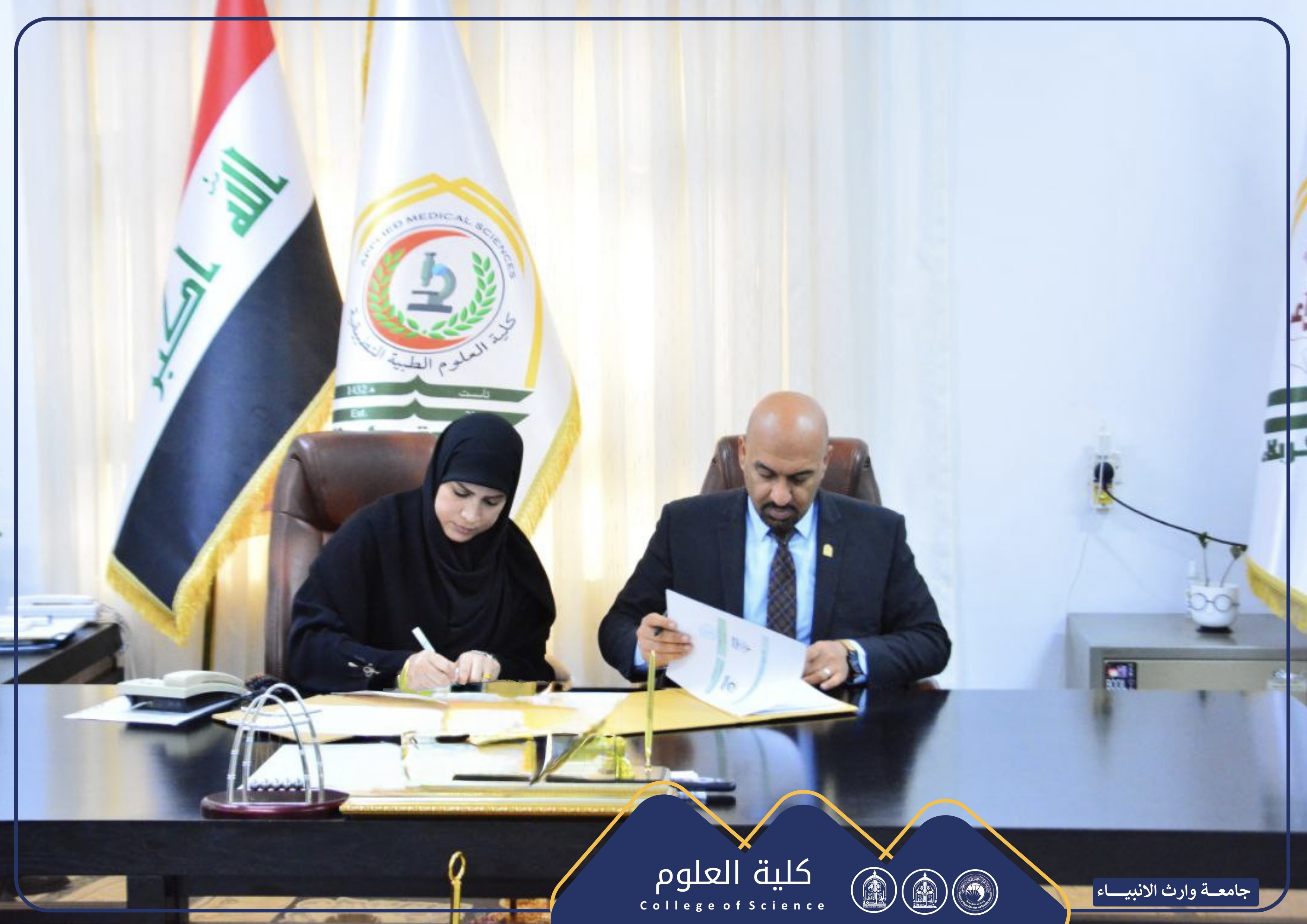 في إطار تعزيز التعاون الأكاديمي وتبادل الخبرات العلمية، وقّعت الأستاذ المساعد الدكتورة شيماء حسين نوفل، عميدة كلية العلوم بجامعة وارث الانبياء عليه السلام، اتفاقية توأمة علمية مع الأستاذ المساعد الدكتور حسن فيصل اليساري ، عميد كلية العلوم الطبية التطبيقية في جامعة كربلاء.
