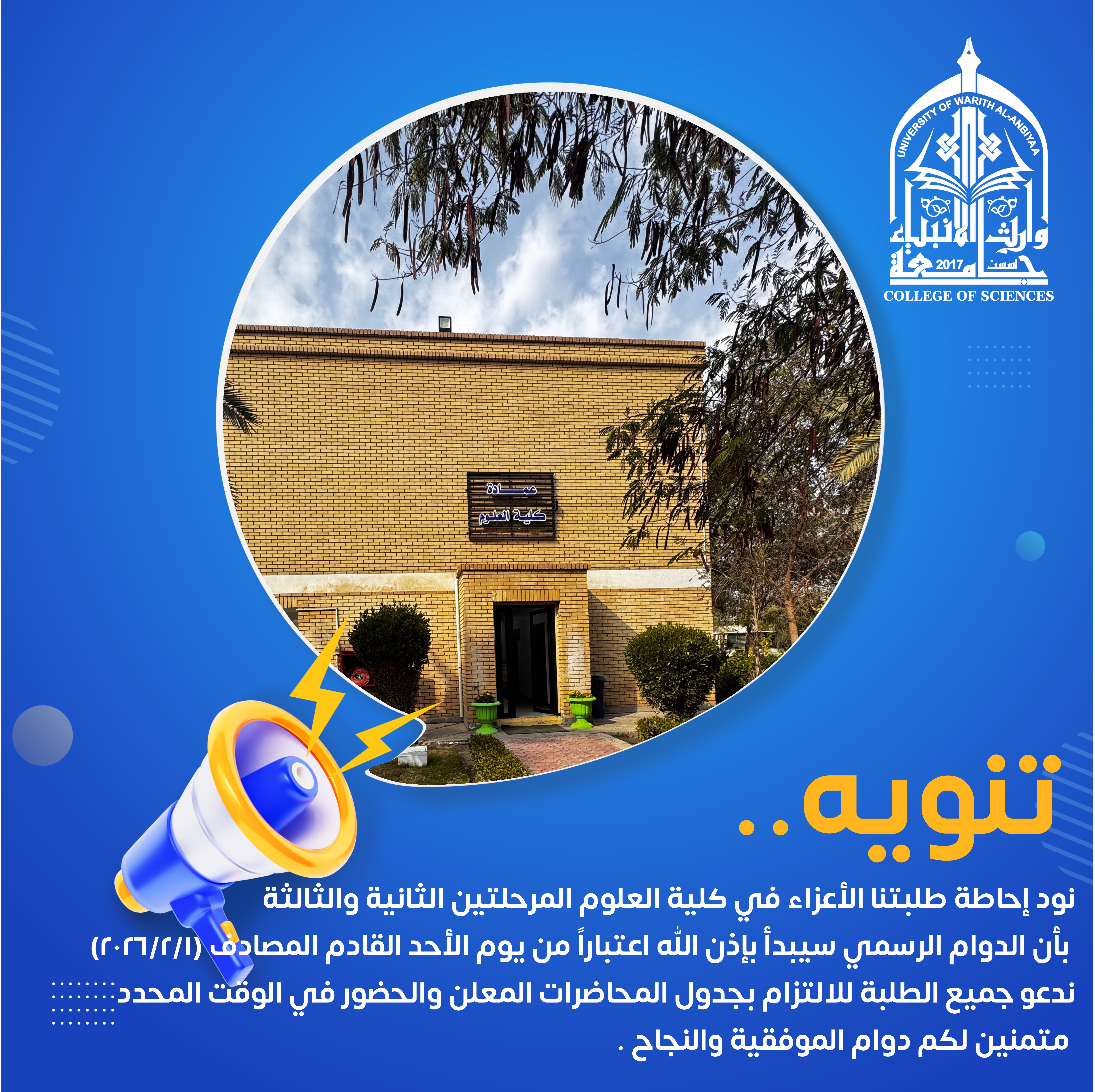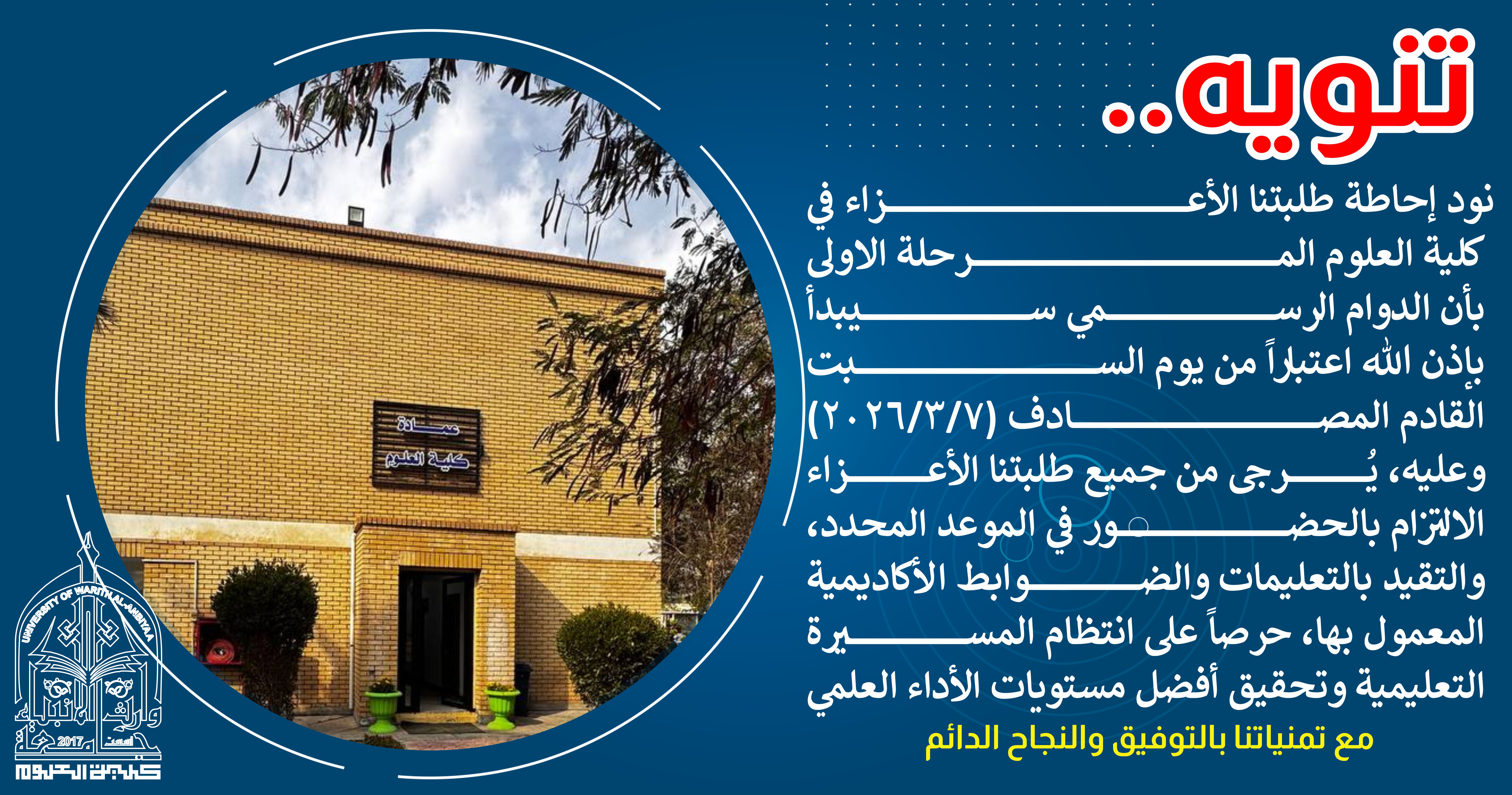 نود إحاطة طلبتنا الأعزاء في كلية العلوم المرحلة الاولى بأن الدوام الرسمي سيبدأ بإذن الله اعتباراً من يوم السبت القادم المصادف (2026/3/7)وعليه، يُرجى من جميع طلبتنا الأعزاء الالتزام بالحضور في الموعد المحدد،والتقيد بالتعليمات والضوابط الأكاديمية المعمول بها، حرصاً على انتظام المسيرة التعليمية وتحقيق أفضل مستويات الأداء العلميمع تمنياتنا بالتوفيق والنجاح الدائم...