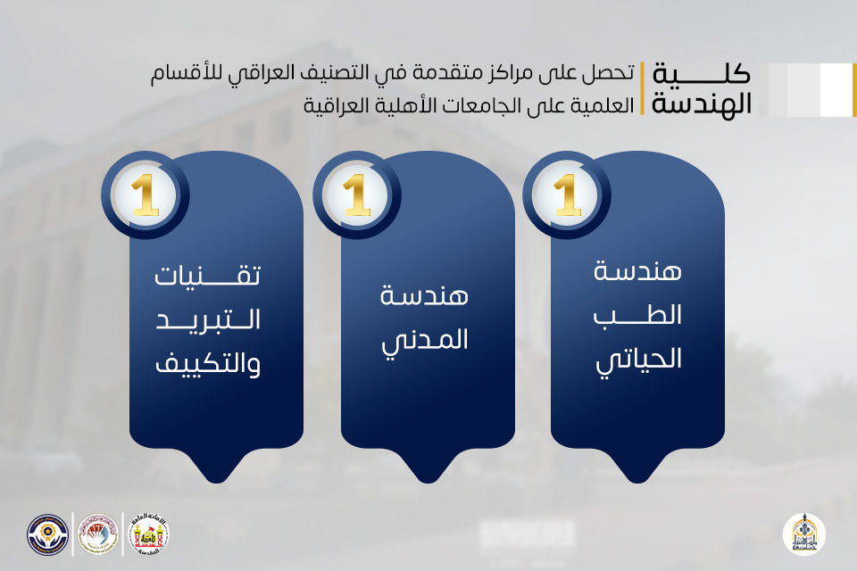 وأحرز قسم هندسة الطب الحياتي المركز الأول على مستوى الجامعات الأهلية والمرتبة الخامسة حكوميًا، فيما حقق قسم الهندسة المدنية المركز الأول أهليًا والمرتبة التاسعة على الجامعات الحكومية، إلى جانب تصدر قسم هندسة تقنيات التبريد والتكييف المرتبة الأولى على مستوى الجامعات الأهلية والحكومية في العراق.