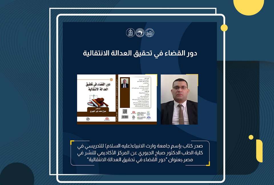 أصدر الدكتور صباح الجبوري، التدريسي في كلية الطب بجامعة وارث الأنبياء (عليه السلام)، كتاباً جديداً بعنوان "دور القضاء في تحقيق العدالة الانتقالية". تم نشر الكتاب بواسطة المركز الأكاديمي للنشر في مصر، ويستعرض فيه الجبوري