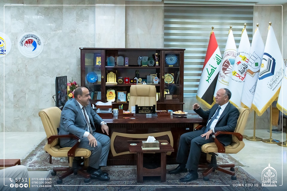 رئيس جامعة وارث الأنبياء (عليه السلام) الأستاذ الدكتور إبراهيم الحياوي يستقبل رئيس قسم الإعلام في العتبة الحسينية المقدسة المهندس عباس الخفاجي، وذلك لتعزيز التعاون بين قسم الاعلام في العتبة الحسينية المقدسة ورئاسة الجامعة.