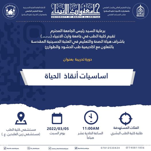 تحت رعاية رئيس جامعة وارث الأنبياء (عليه السلام) الاستاذ الدكتور ابراهيم الحياوي تقيم كلية الطب في الجامعة دورة تدريبية بعنوان (أساسيات انقاذ الحياة)، وذلك بإشراف هيأة الصحة والتعليم في العتبة الحسينية المقدسة وبالتعاون مع أكاديمية طب الحشود والطوارئ.