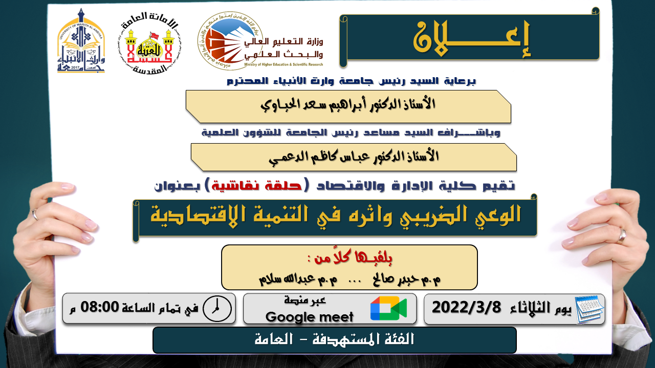 يقيم مركز التعليم المستمر في جامعة وارث الانبياء (عليه السلام) بالتعاون مع كلية الادارة والاقتصاد حلقة نقاشية بعنوان "الوعي الضريبي واثره في التنمية الاقتصادية"، يلقيها ... م.م حيدر صالح و م.م عبدالله سلام .