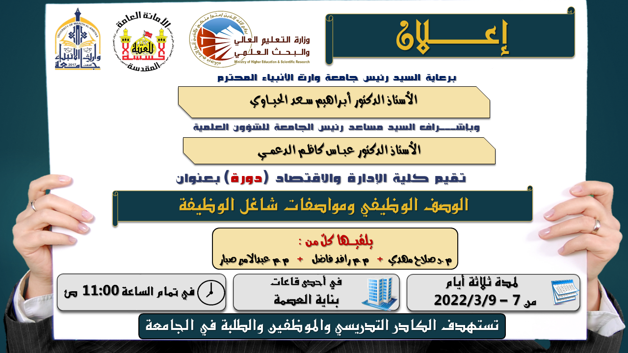 يقيم مركز التعليم المستمر في جامعة وارث الانبياء (عليه السلام) بالتعاون مع كلية الادارة والاقتصاد دورة تدريبية بعنوان "الوصف الوظيفي ومواصفات شاغل الوظيفة"، يلقيها كلٌ من:  م.د صلاح مهدي اليساري و م.م رافد فاضل مراد و م.م عبدالامير صبار خشيف.