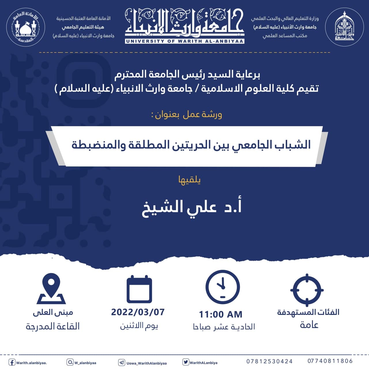 برعاية السيد رئيس جامعة وارث الأنبياء (عليه السلام)، تقيم كلية العلوم الاسلامية في الجامعة، ورشة عمل بعنوان " الشباب الجامعي بين الحريتين المطلقة والمنضبطة"، يلقيها أ.د علي الشيخ