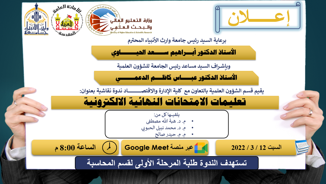علما بان الفئة المستهدفة هم طلبة المرحلة الأولى في قسم المحاسبة، والهدف من الندوة هو توضيح آلية الامتحان النهائي الالكتروني