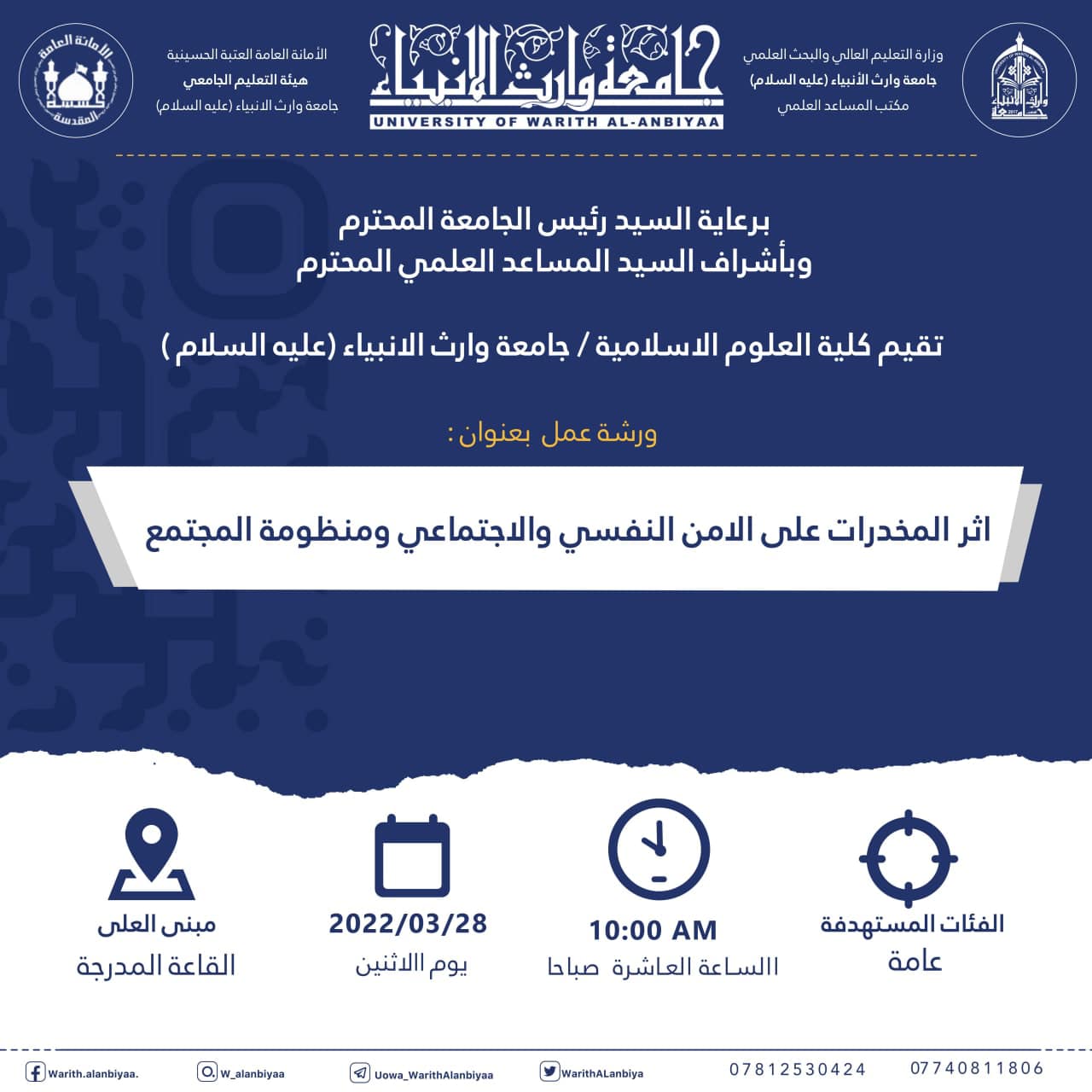 برعاية السيد رئيس الجامعة والمساعد العلمي، تقيم كلية العلوم الاسلامية في جامعة وارث الأنبياء (عليه السلام)، ورشة عمل بعنوان " أثر المخدرات على الأمن النفسي والاجتماعي ومنظومة المجتمع" وذلك في تمام العاشرة من صباح اليوم الاثنين 28-3-2022 على القاعة المدرجة في مبنى العلى داخل الجامعة