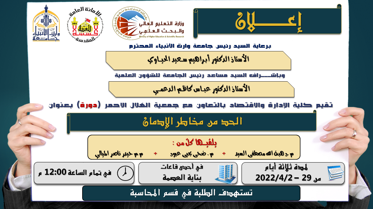 يقيم مركز التعليم المستمر في جامعة وارث الانبياء (عليه السلام) بالتعاون مع كلية الادارة والاقتصاد وجمعية الهلال الاحمر دورة تدريبية بعنوان "الحد من مخاطر الإدمان"، يلقيها كلٌ من: السيدة (م.د هبة الله مصطفى السيد .. رئيساً)  و السيدة (م.ضحى يحيى عبود .. جمعية الهلال الاحمر محاضراً)   والسيد  (م.م حيدر ناصر الميالي .. مقرراً).وذلك بدءا من يوم الثلاثاء الموافق 2022/3/29 وفي تمام الساعة 12:00 مساءً في احدى القاعات الدراسية في بناية العصمة ولمدة ثلاثة ايام ، الفئة المستهدفة - طلبة قسم المحاسبة  .