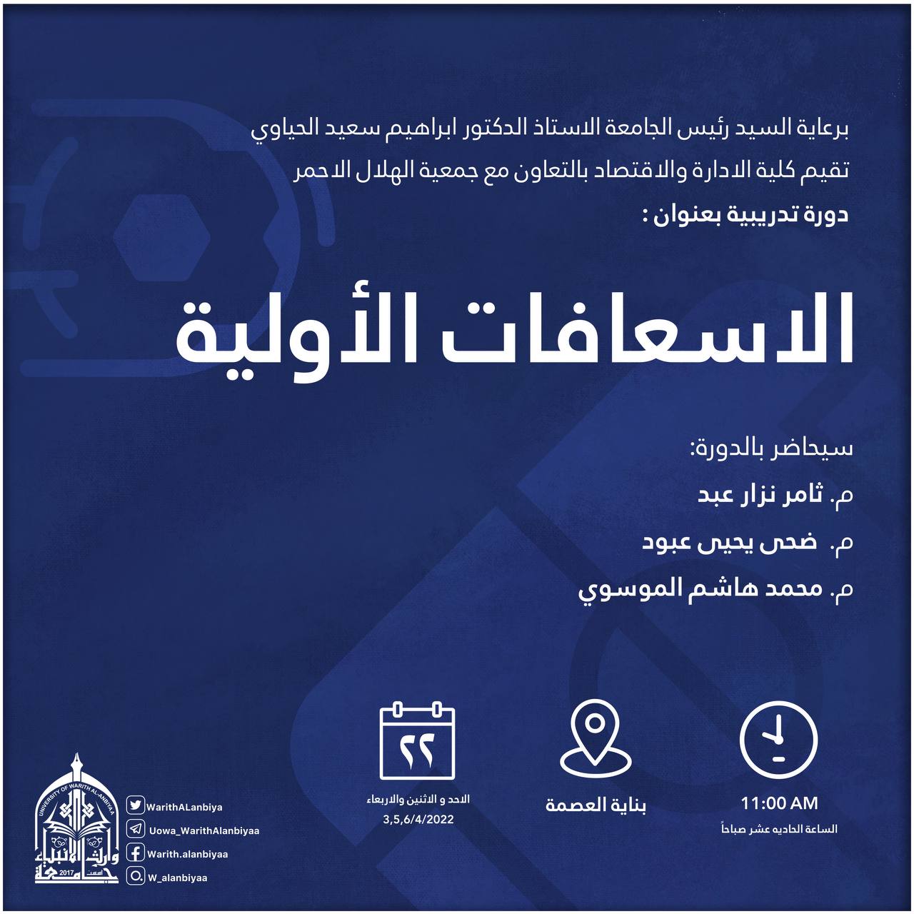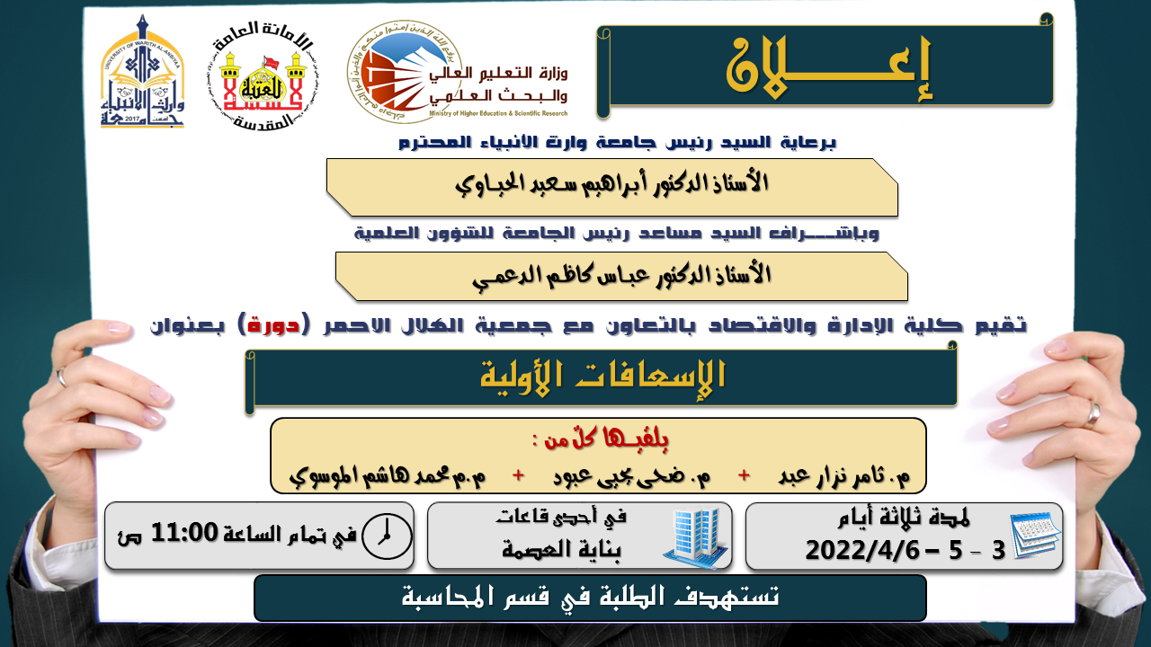 يقيم مركز التعليم المستمر في جامعة وارث الانبياء (عليه السلام) بالتعاون مع كلية الادارة والاقتصاد وجمعية الهلال الاحمر دورة تدريبية بعنوان "الإسعافات الأولية"، يلقيها كلٌ من: السيد (م. ثامر نزار عبد .. رئيساً)  و السيدة (م.ضحى يحيى عبود .. جمعية الهلال الاحمر محاضراً)   والسيد  (م.م محمد هاشم الموسوي .. مقرراً).ولمدة ثلاثة ايام ( الأحد - الثلاثاء - الاربعاء) 3-5-6/ 2022/4 وفي تمام الساعة 11:00 صباحاً في احدى القاعات الدراسية في بناية العصمة  ، الفئة المستهدفة - طلبة قسم المحاسبة  .