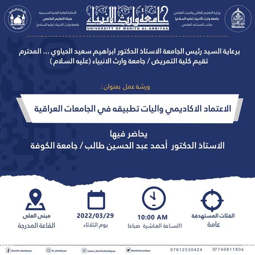 أقامت كلية التمريض في جامعة وارث الأنبياء (عليه السلام) ورشة عمل بعنوان "الاعتماد الاكاديمي وآليات تطبيقه في الجامعات العراقية" حاضر فيها الاستاذ الدكتور أحمد عبد الحسين طالب من جامعة الكوفة، وذلك يوم الثلاثاء 29-3-2022 على القاعة المدرجة في مبنى العلا داخل الجامعة.
