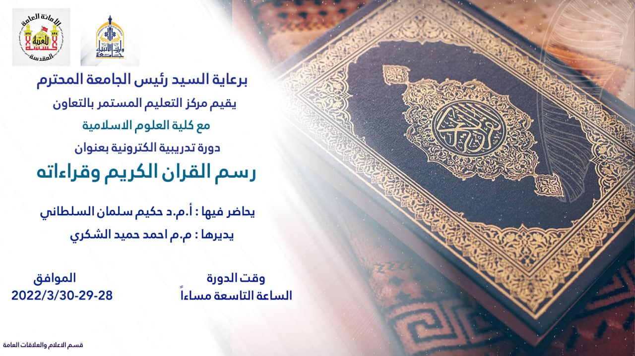 أقام قسم التعليم المستمر وبالتعاون مع كلية العلوم الاسلامية دورة تدريبية افتراضية تحت عنوان "رسم القران الكريم وقراءاته" حاضر فيها أ.م.د حكيم سلمان السلطاني وأدارها م.م أحمد الشكرجي، واستمرت الدورة ثلاثة أيام متواصلة بتأريخ  28-29-30/ 3 / 2022