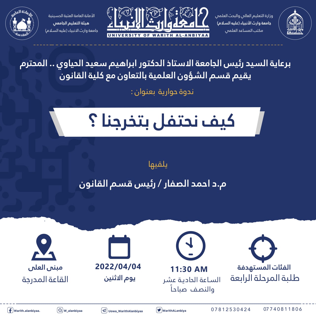 برعاية رئيس الجامعة الاستاذ الدكتور ابراهيم الحياوي يقيم قسم الشؤون العلمية وبالتعاون مع كلية القانون ندوة حوارية تحت عنوان " كيف نحتفل بتخرجنا؟ " يلقيها