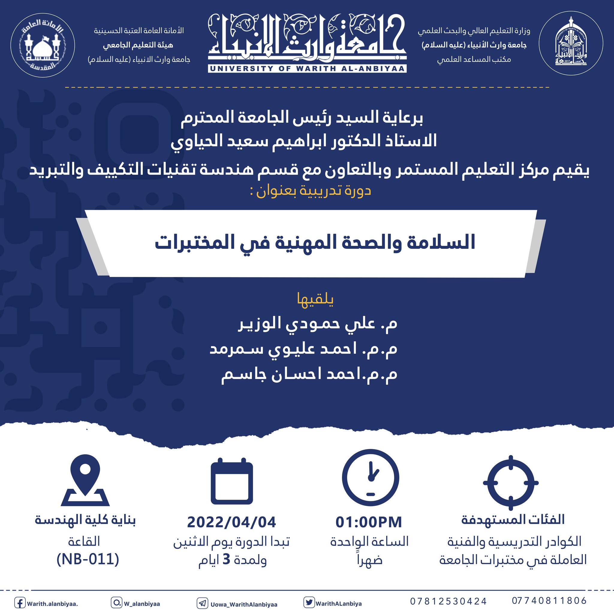 وذلك بدءا من يوم الاثنين الموافق 2022/3/7 وفي تمام الساعة 11:00 صباحاً في احدى القاعات الدراسية في بناية العصمة ولمدة ثلاثة ايام ، الفئات المستهدفة - اعضاء الهيئة التدريسية والموظفين والطلبة في الجامعة.