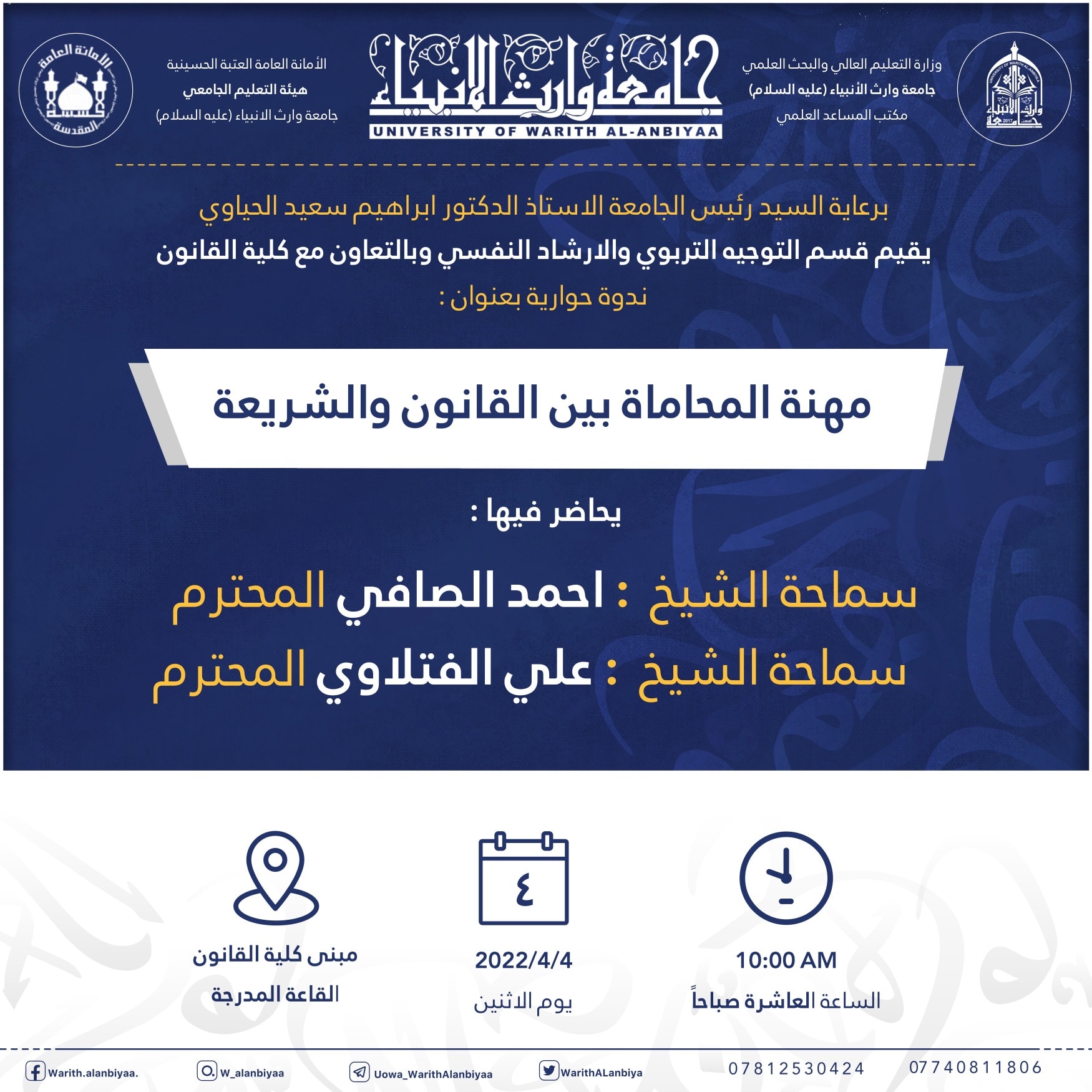 برعاية رئيس الجامعة الاستاذ الدكتور ابراهيم الحياوي أقام التوجية التربوي والارشاد النفسي وبالتعاون مع كلية القانون ندوة حوارية بعنوان " مهنة المحاماة بين القانون والشريعة "