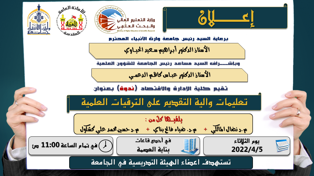 قيم مركز التعليم المستمر في جامعة وارث الانبياء (عليه السلام) بالتعاون مع كلية الادارة والاقتصاد ندوة بعنوان (تعليمات والية التقديم على الترقيات العلمية):من قبل السادة:- م.د نضال عبدالله ياسين المالكي - م.د. ضياء فالح بناي- م.د حسين محمد علي كشكول، وذلك في يوم الثلاثاء الموافق 5 / 4 / 2022 وفي تمام الساعة 11:00 صباحاً في احدى القاعات الدراسية في بناية العصمة. والفئة المستهدفة اعضاء الهيئة التدريسية في الجامعة .