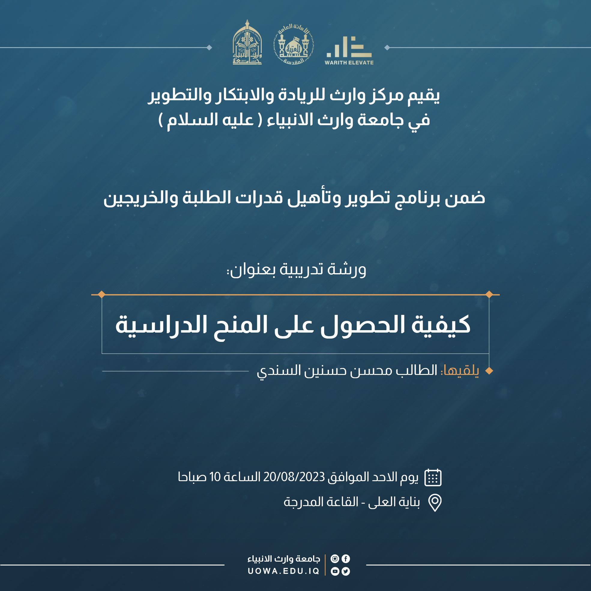 يقيم مركز وارث للريادة والابتكار والتطوير في جامعة وارث الأنبياء (عليه السلام)، ضمن برنامج تطوير وتأهيل قدرات الطلبة والخريجين، ورشة تدريبية بعنوان (كيفية الحصول على المنح الدراسية)