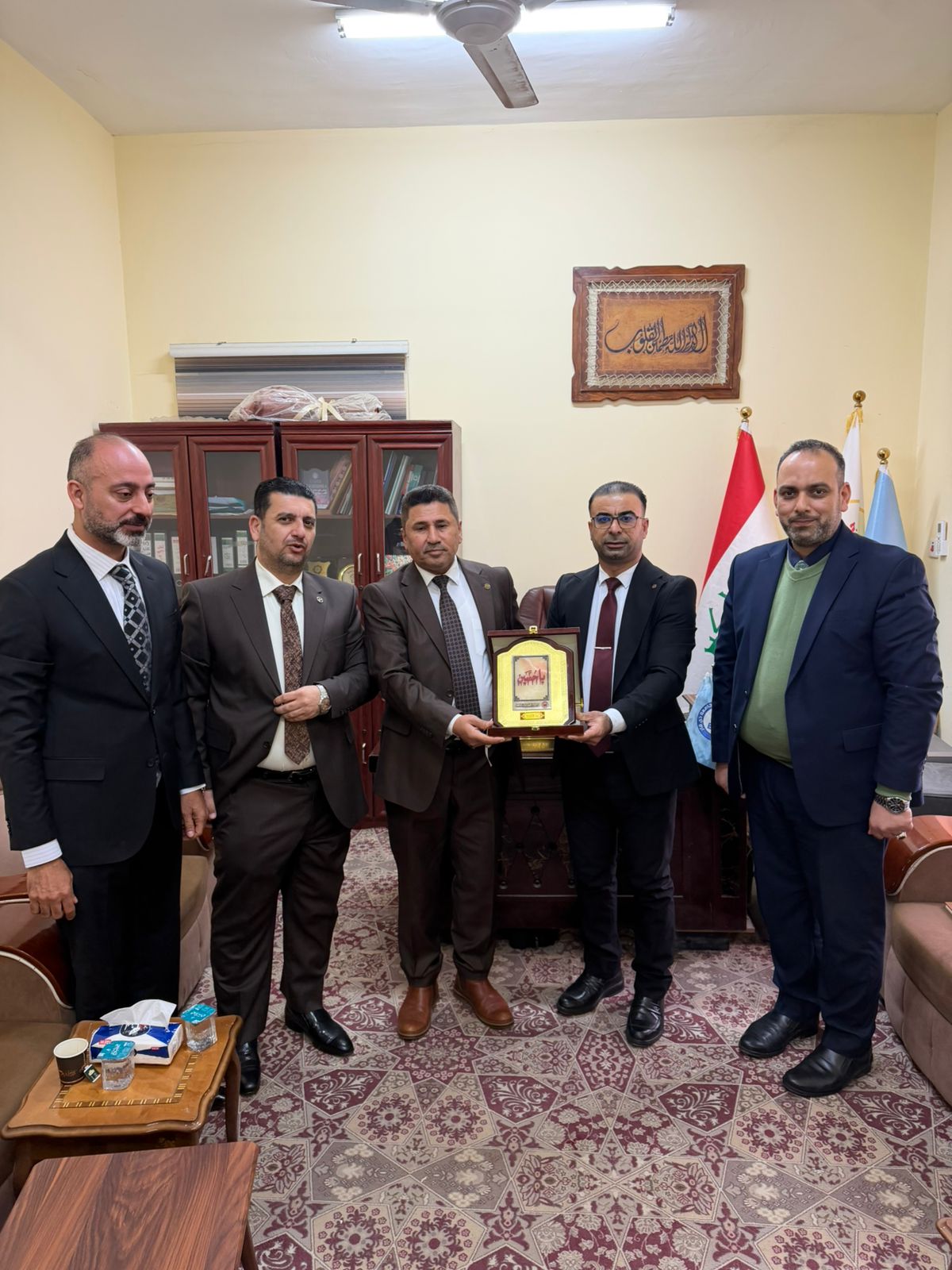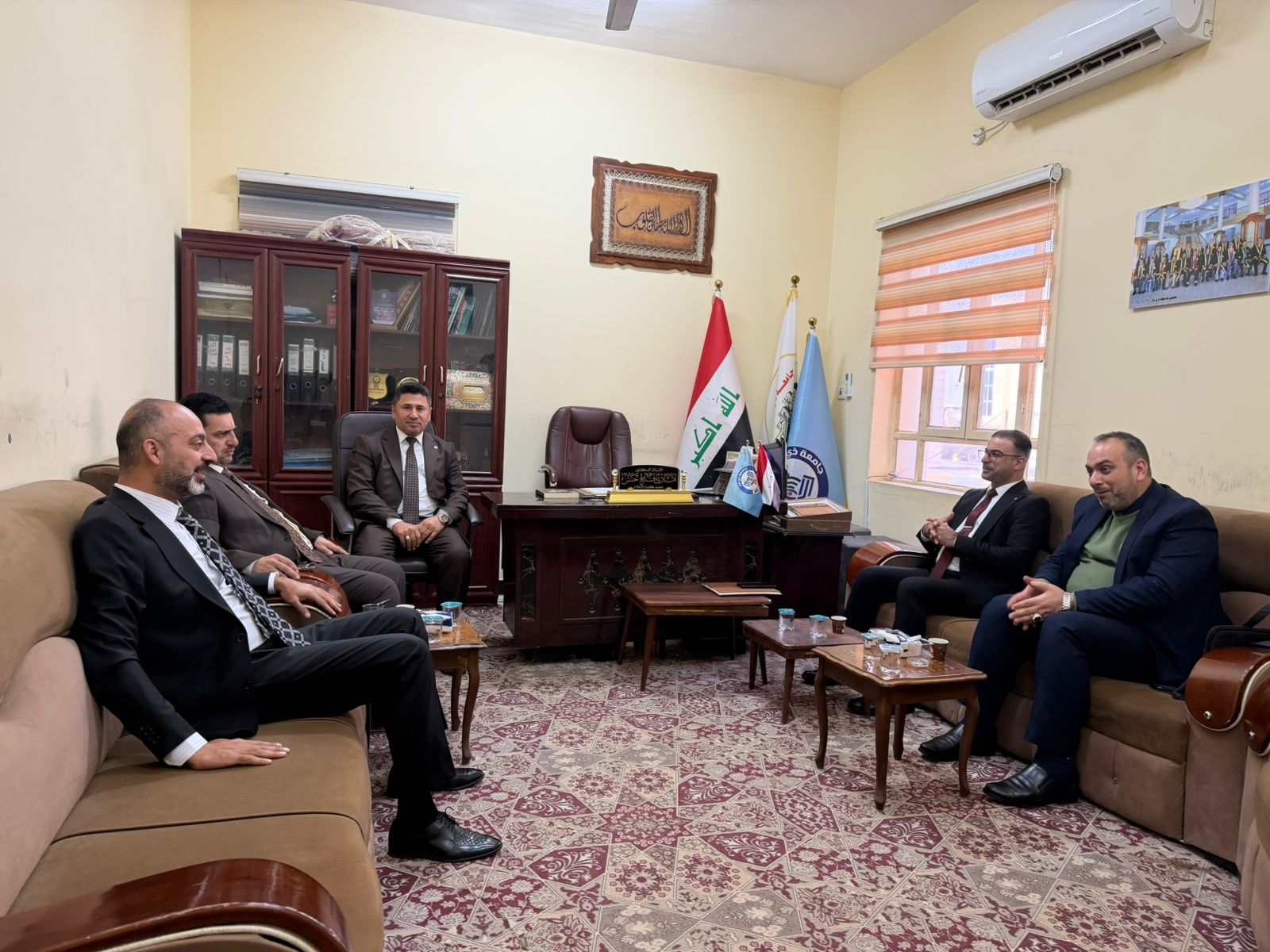 A delegation from the Faculty of Media at Al-Waritheen University, affiliated with the Holy Hussein Shrine, discussed with the deanship of the Faculty of Media at Thi Qar University the latest developments in the field of media, artificial intelligence, and joint evaluation exams