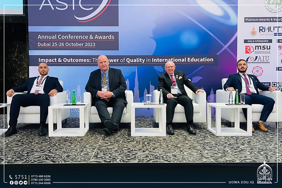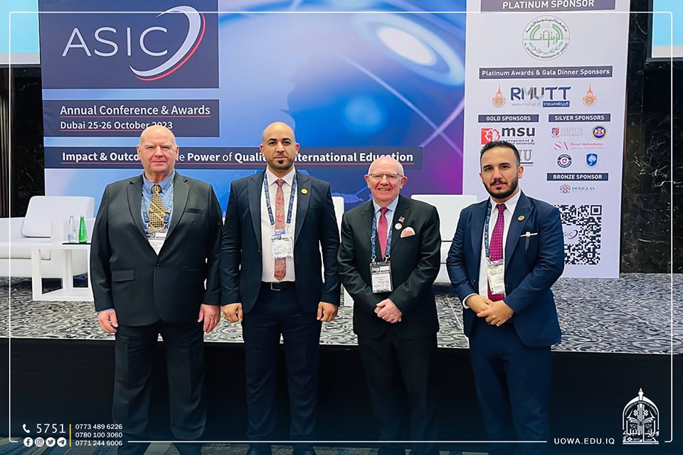 The Director of the Center for Continuing Education, Assistant Professor Dr. Haider Al-Ghanimi, and the Head of the Quality Assurance Department, Assistant Lecturer Hussein Hazim, participated in the international conference organized by the British organization ASIC (Academic and Institutional Accreditation). ASIC is an accreditation body for various international universities, institutes, and other academic institutions. The conference was held under the theme "The Impact and Results of Quality in Global Education." The university was honored with the Excellence Shield for its efforts in supporting students in various areas, including scholarships, discounts, and voluntary work in community service.