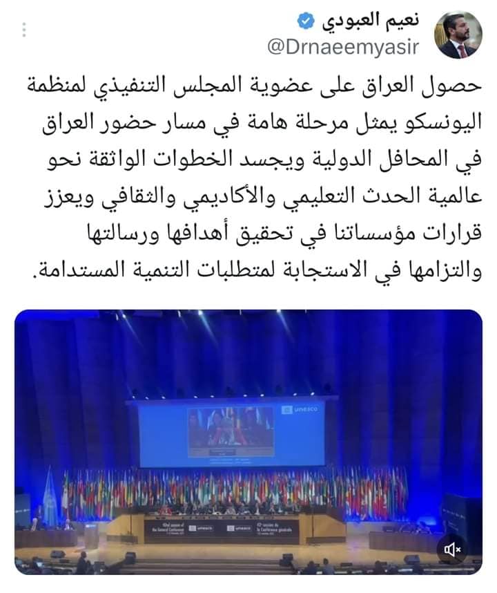 Our country, Iraq, has secured membership in the Executive Board of UNESCO, considered the highest scientific and cultural authority in the world. On this occasion, the Minister of Higher Education and Scientific Research, Dr. Naeem Al-Aboudi, emphasized that Iraq's membership in the Executive Board of UNESCO reinforces the decisions of our institutions in achieving their goals, missions, and commitment to responding to the requirements of sustainable development.