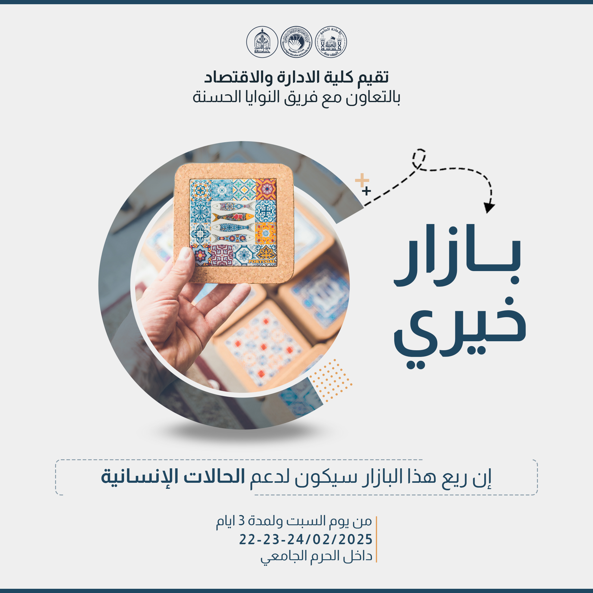 The College of Administration and Economics, in collaboration with the Goodwill Team, is organizing a charity bazaar at Warith Al-Anbiya University within the university campus. The event will commence on Saturday, February 22, 2025, and will run for three days.