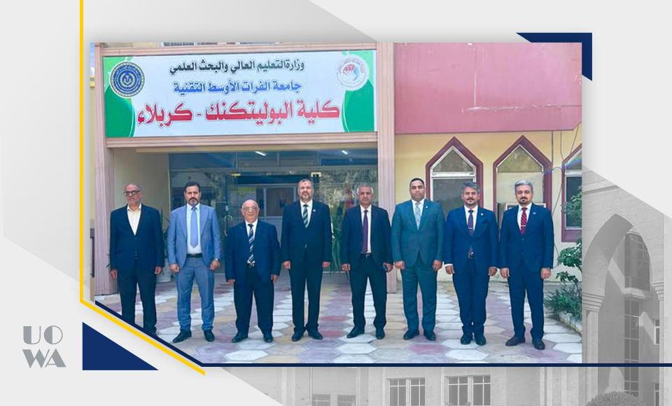 As part of strengthening academic relations and exchanging congratulations between educational institutions, a delegation from the University of Warith al-Anbiya, headed by Professor Awad Al-Khalidi, Dean of the College of Administration and Economics, made an official visit to the Polytechnic College to offer congratulations on its transformation from a technical institute to a college.