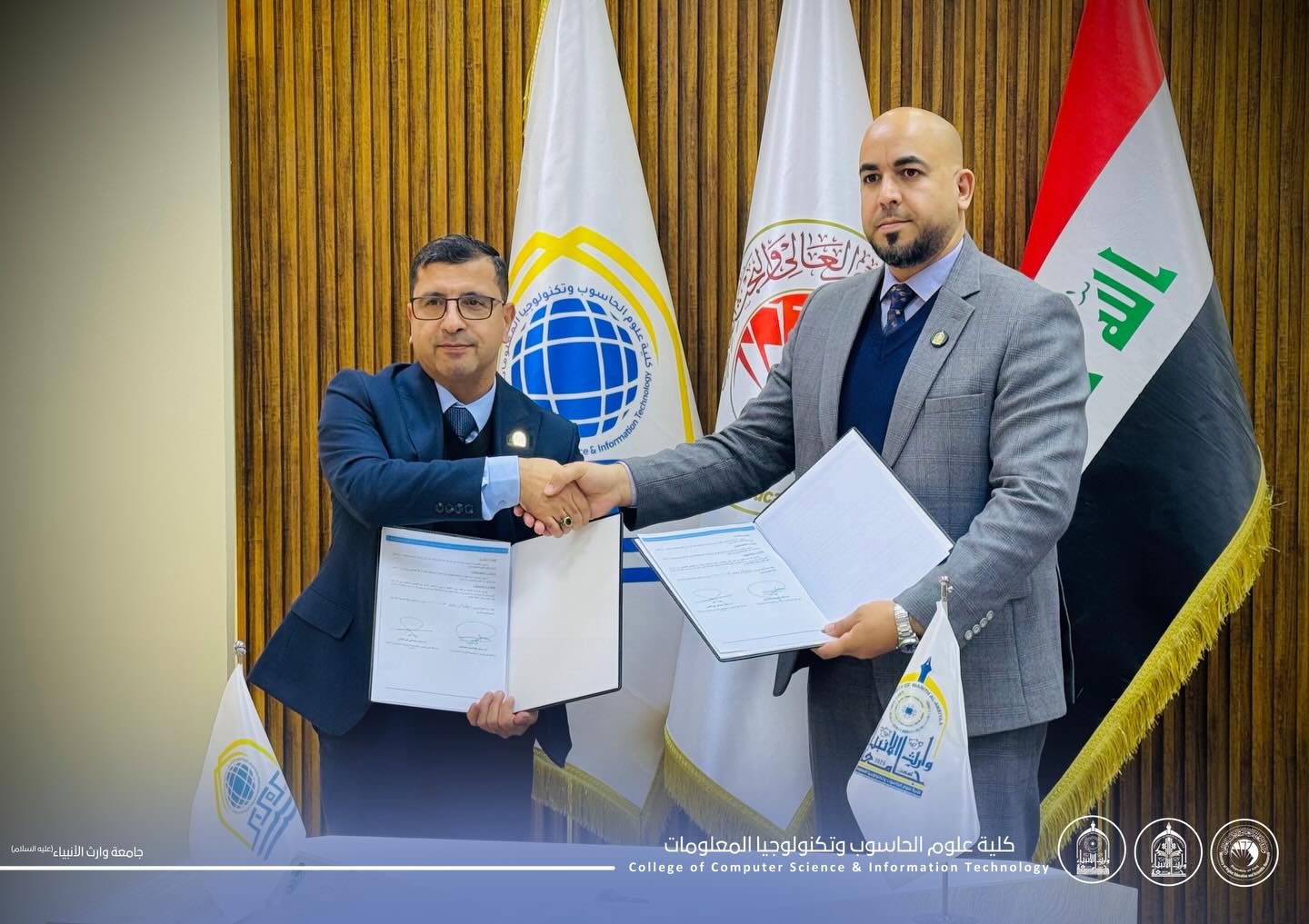 Within the framework of strengthening academic cooperation and exchanging scientific expertise, Assistant Professor Dr. Haider Mohammed Ali Al-Ghanimi, Dean of the College of Computer Science and Information Technology at the University of Warith Al-Anbiyaa (peace be upon him), signed a scientific twinning agreement with Professor Dr. Salah Awwad Salman Al-Issawi, Dean of the College of Computer Science and Information Technology at the University of Anbar.