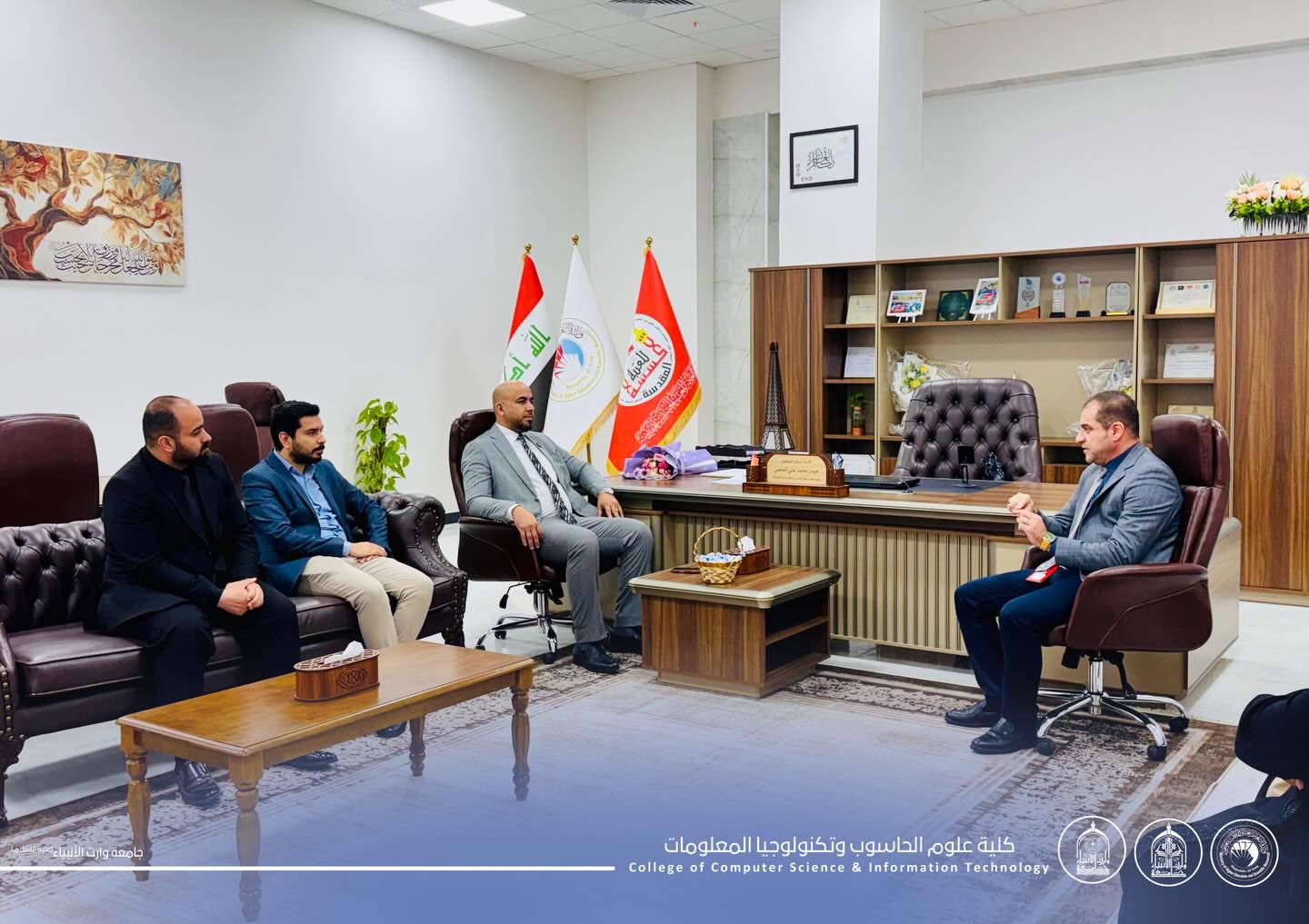 The Dean of the College of Computer Science and Information Technology, Assistant Professor Dr. Haider Mohammed Ali Al-Ghanami, received a high-level delegation from the College of Engineering – Warith Al-Anbiyaa University, headed by Assistant Professor Dr. Hussein Hadi Hussein, Dean of the College, accompanied by a group of faculty members.