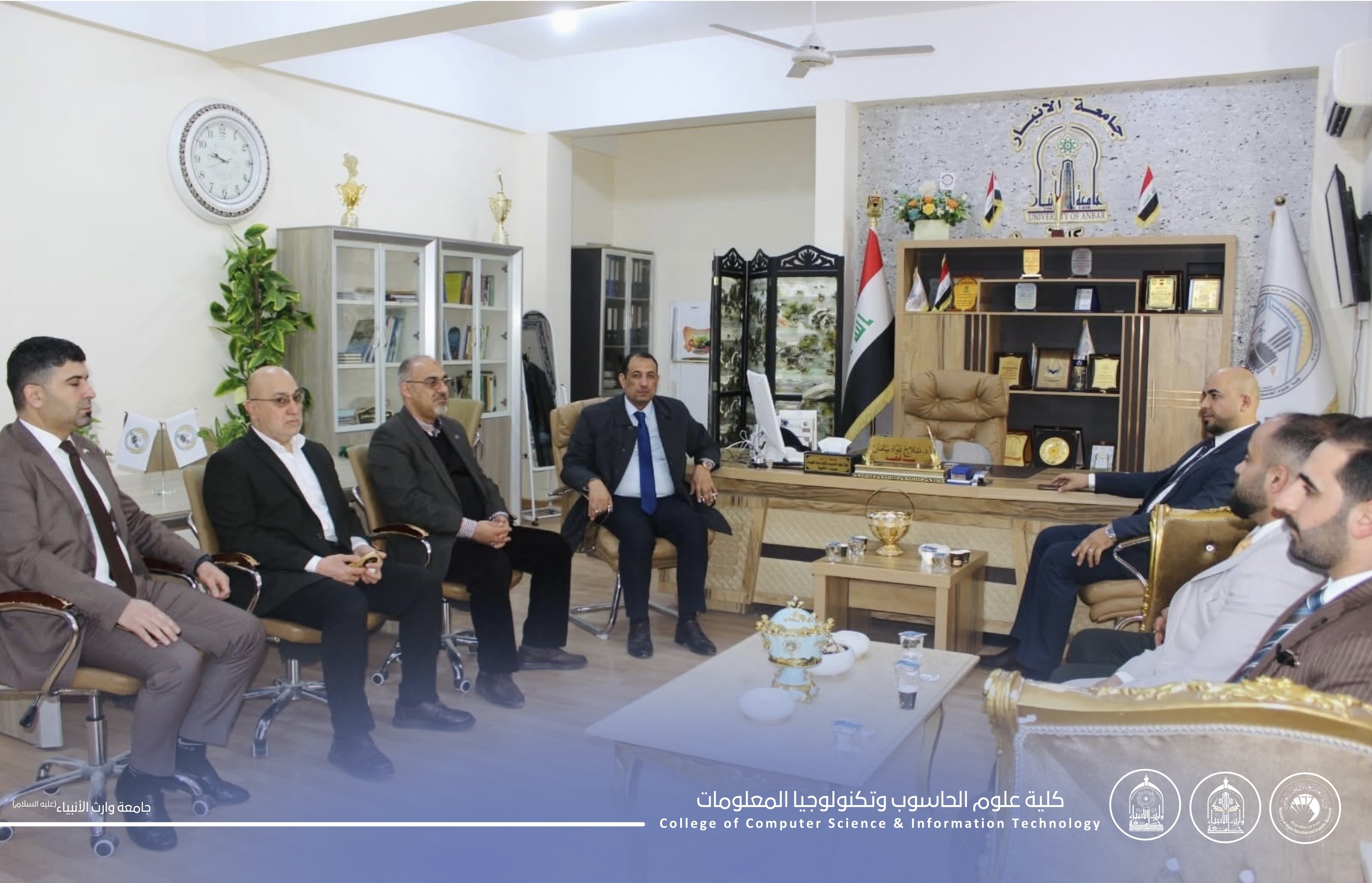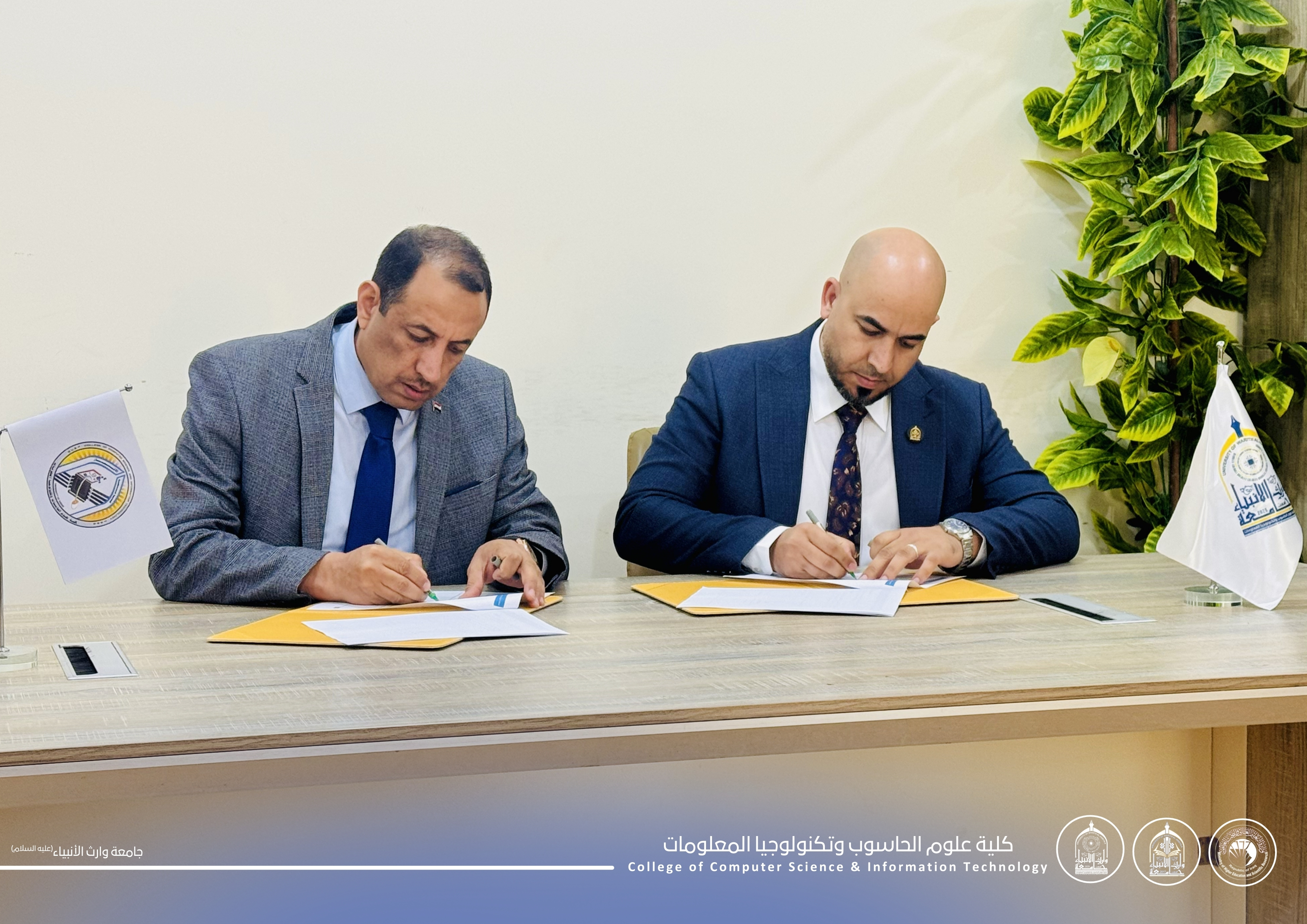 Within the framework of strengthening academic cooperation and exchanging scientific expertise, Assistant Professor Dr. Haider Mohammed Ali Al-Ghanimi, Dean of the College of Computer Science and Information Technology at the University of Warith Al-Anbiyaa (peace be upon him), signed a scientific twinning agreement with Professor Dr. Salah Awwad Salman Al-Issawi, Dean of the College of Computer Science and Information Technology at the University of Anbar.