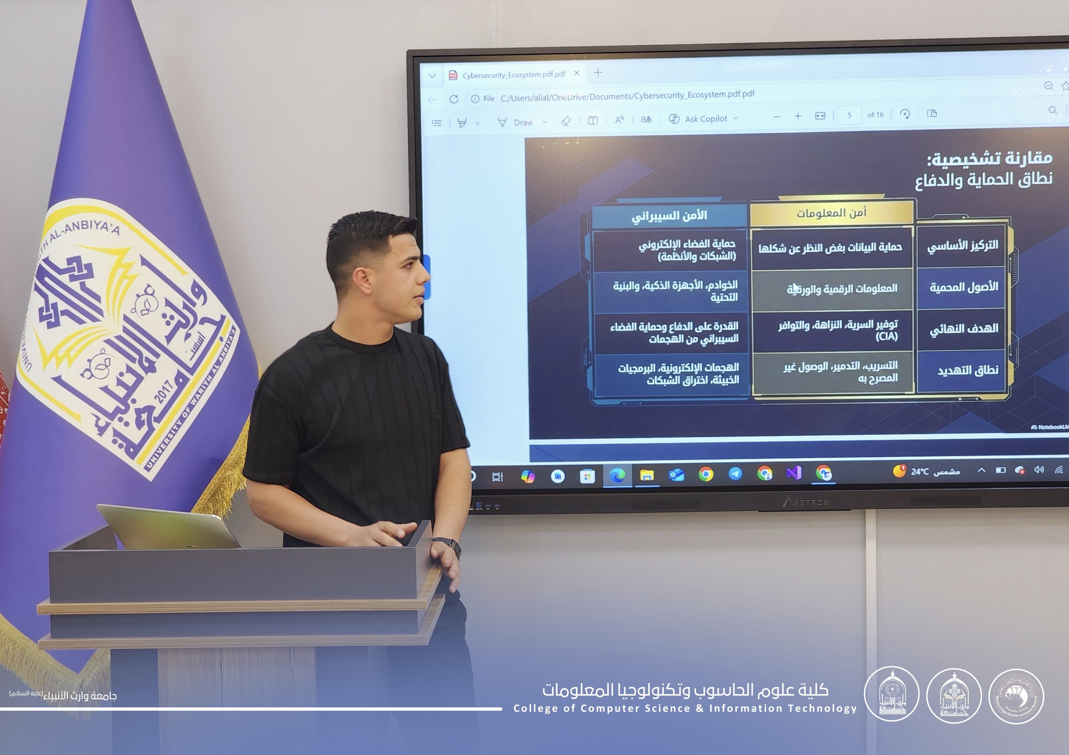 , students from the Cybersecurity Department conducted scientific workshops for their peers titled: "How to Create Mobile Applications Without Code" and "The Difference Between Data Security and Cybersecurity." This initiative aims to exchange knowledge and keep pace with rapid technological advancements.