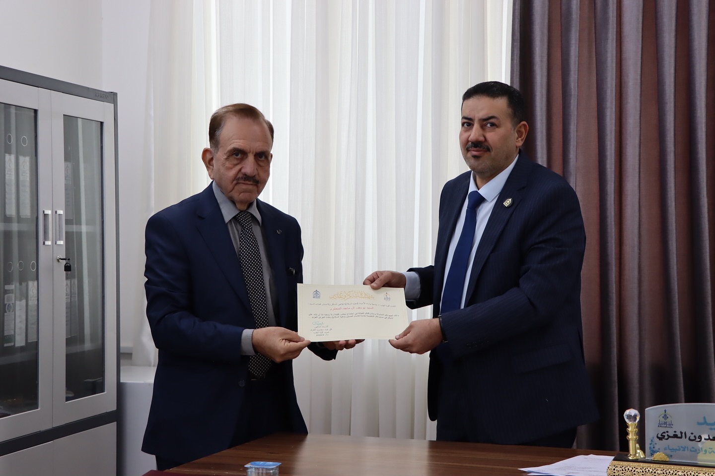 On Wednesday, November 26, 2025, the Dean of the College honored Professor Dr. Mu'ayyad Al-Naqeeb at the university campus in recognition of his significant medical achievement: performing the first successful liver transplant in Iraq.